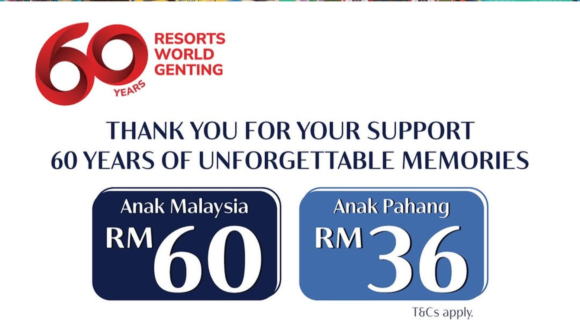 云顶天城世界主题乐园只要65令吉! 9 Feb , 2025 | 吃喝玩乐 云顶天城世界主题乐园为了庆祝2月8号迎来3周年,准备了独家优惠,其中就是云顶天城主题乐园的马来西亚公民门票将从原本的164令吉下降至60令吉,非马公民则从原本的198令吉下降至120令吉。 而彭亨州公民在售票处直接购买只需要花36令吉。除了独家优惠,在2月8号生日的人可以兑换一份惊喜神秘礼物。 此活动将从2月8号持续到8月31日结束。 分享