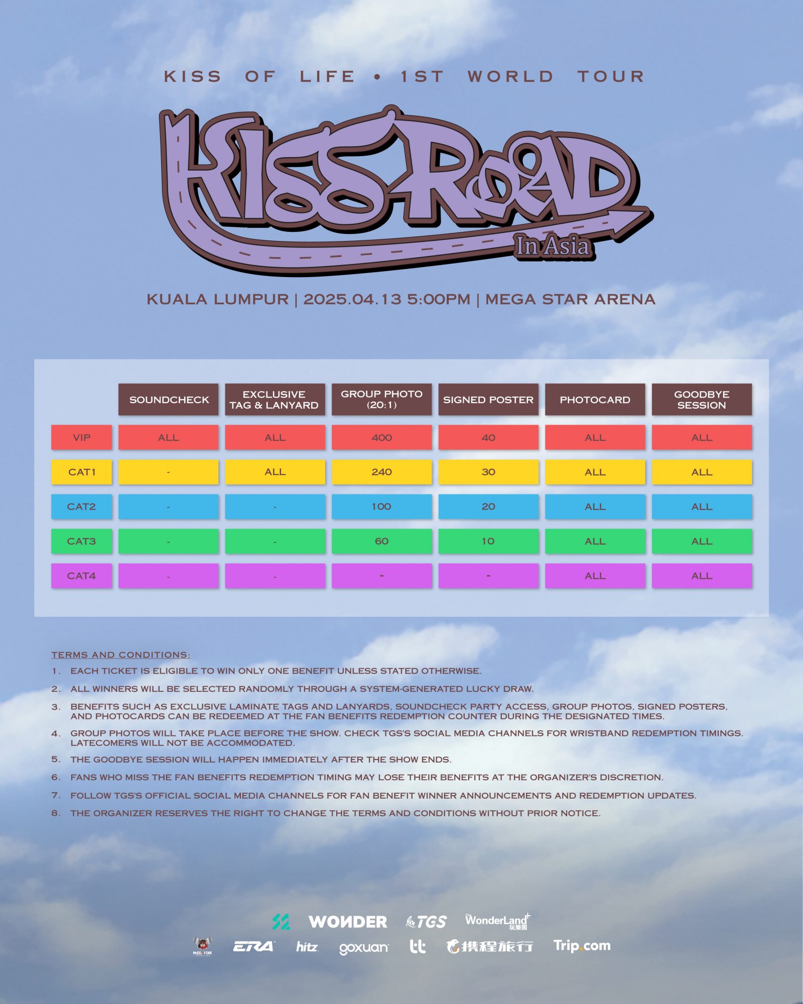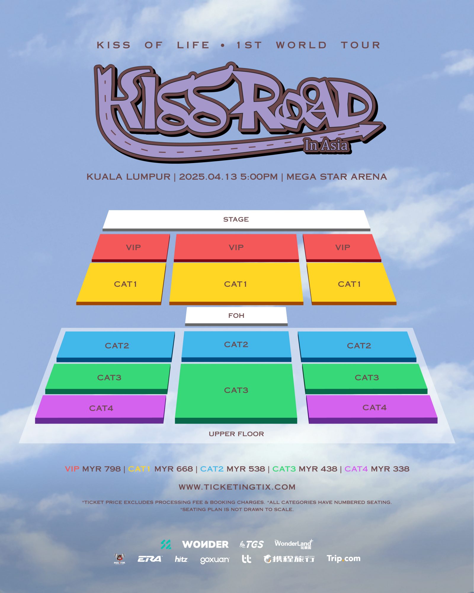 继在韩国、北美和欧洲成功举办 35 场巡演后,KISS OF LIFE 现已准备好通过激动人心的 KISS ROAD 巡演征服亚洲。演唱会门票将于 2 月 15 日(星期六)上午 11 时通过 ticketingtix.com、ctrip.com 及 trip.com 发售,门票类别及票价如下。