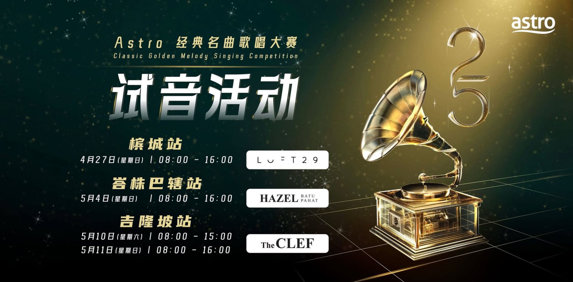 自开播以来,《Astro典名曲歌唱大赛》凭借其不朽的音乐魅力,连续蝉联Astro中文频道同时段最高收视率。2024年更创下近20%的收视成长,印证节目广受观众喜爱。2025年赛事将更加盛大,走入社区,展开全国试音活动,覆盖北马、南马及中马地区,包括槟城乔治市、柔佛峇株巴辖和吉隆坡,共设4场公开试音,寻找更多实力唱将!