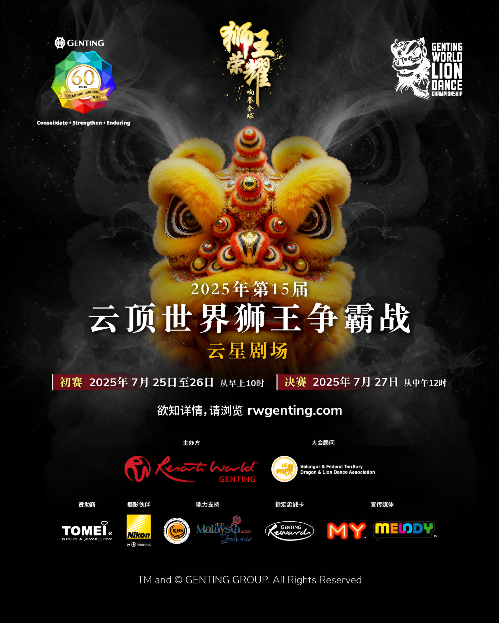 由云顶世界主办,马来西亚雪隆龙狮联合总会为大会顾问的《第15届云顶世界狮王争霸战》,将于7月25日至27日在云顶世界云星剧场震撼开擂。