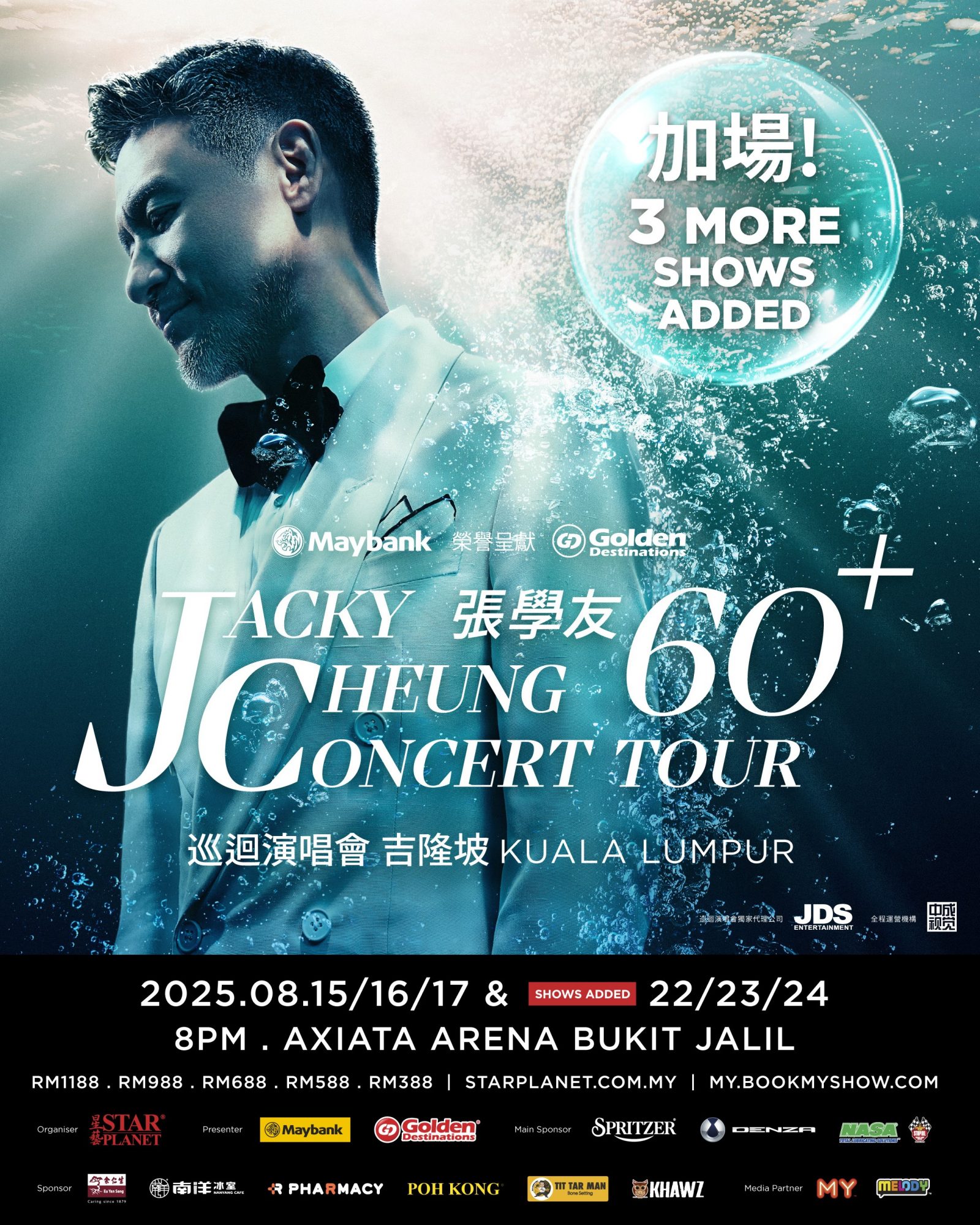 华语乐坛殿堂级巨星“歌神”张学友携《60+ 巡回演唱会》宣布追加三场演出!加场日期定于8月22日、23日及24日,再度于吉隆坡 Axiata Arena Bukit Jalil 引爆全场!