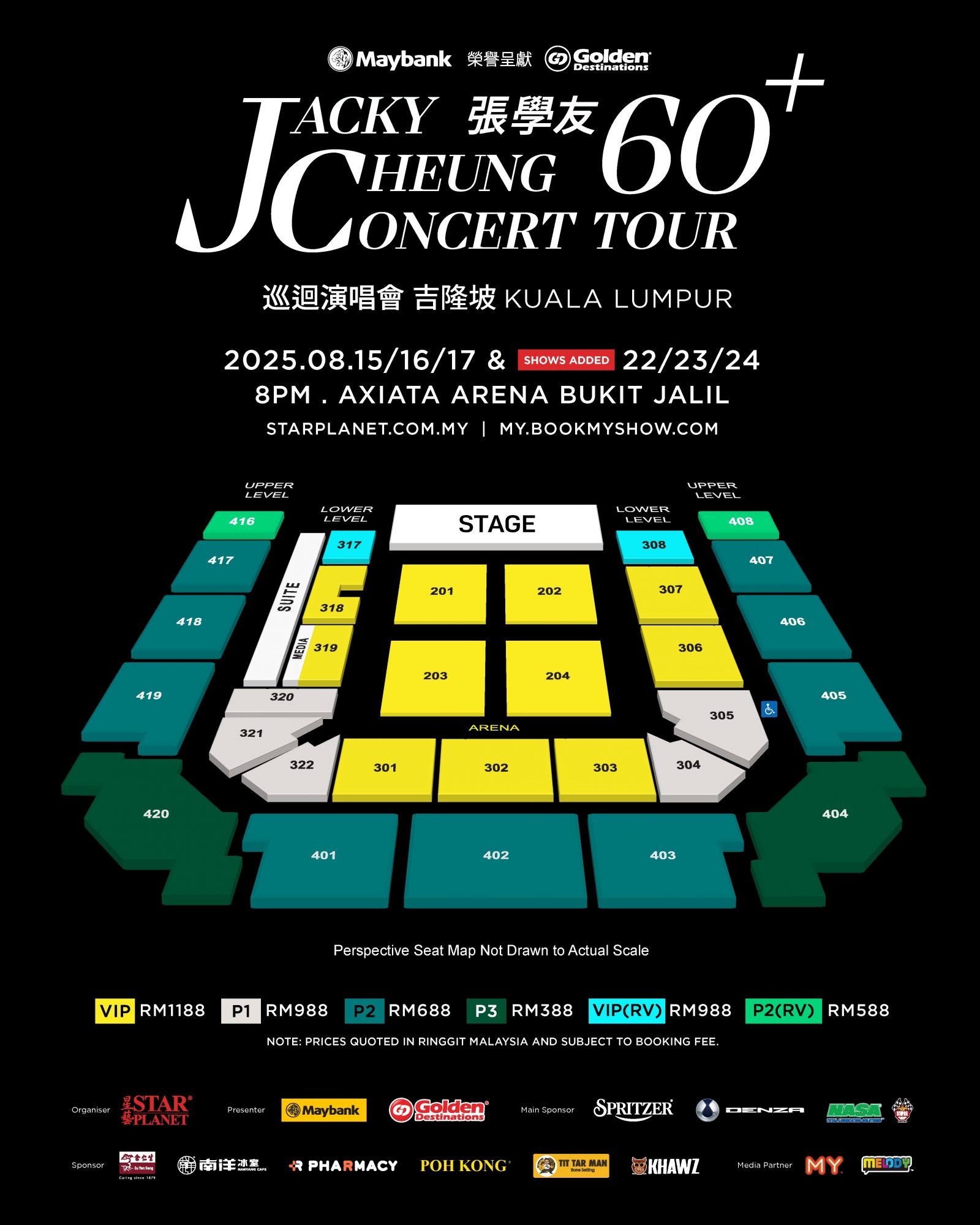 为回应热烈民意,主办单位 Star Planet 星艺娱乐正式宣布追加三场演出!加场日期定于2025年8月22日、23日及24日,再度于吉隆坡 Axiata Arena Bukit Jalil 引爆全场!连同原定的8月15日、16日、17日,张学友将连唱六场,连续两个周末与大马粉丝共度六场震撼人心的音乐盛宴。