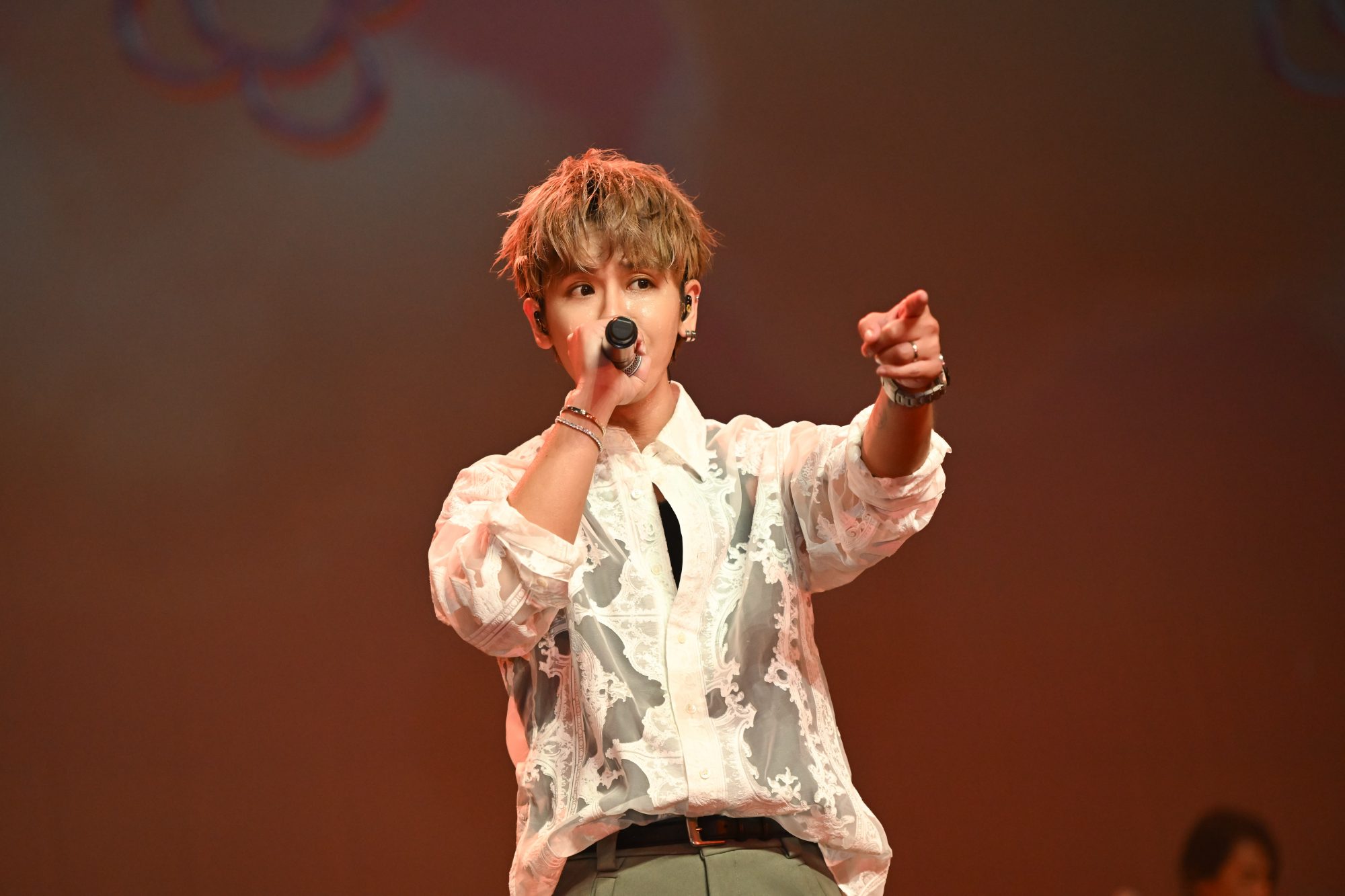 回忆出道10几年来,见证了很多歌迷的成长,这时发现台下有怀孕中的女歌迷捧场,鼓鼓立刻可爱的转换奶音跟肚子里的宝宝说话:“哈喽你好,我是鼓鼓叔叔,等你出来这个世界之后,要来看GX的演唱会哦!”
