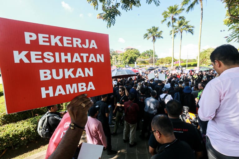 早上八点的布城还带着微微凉意,300多名身穿黑衣的全科医生聚集在首相署前,没有口号、没有喧哗,只有一排排白衣站在阳光下,沉默中透着焦灼。