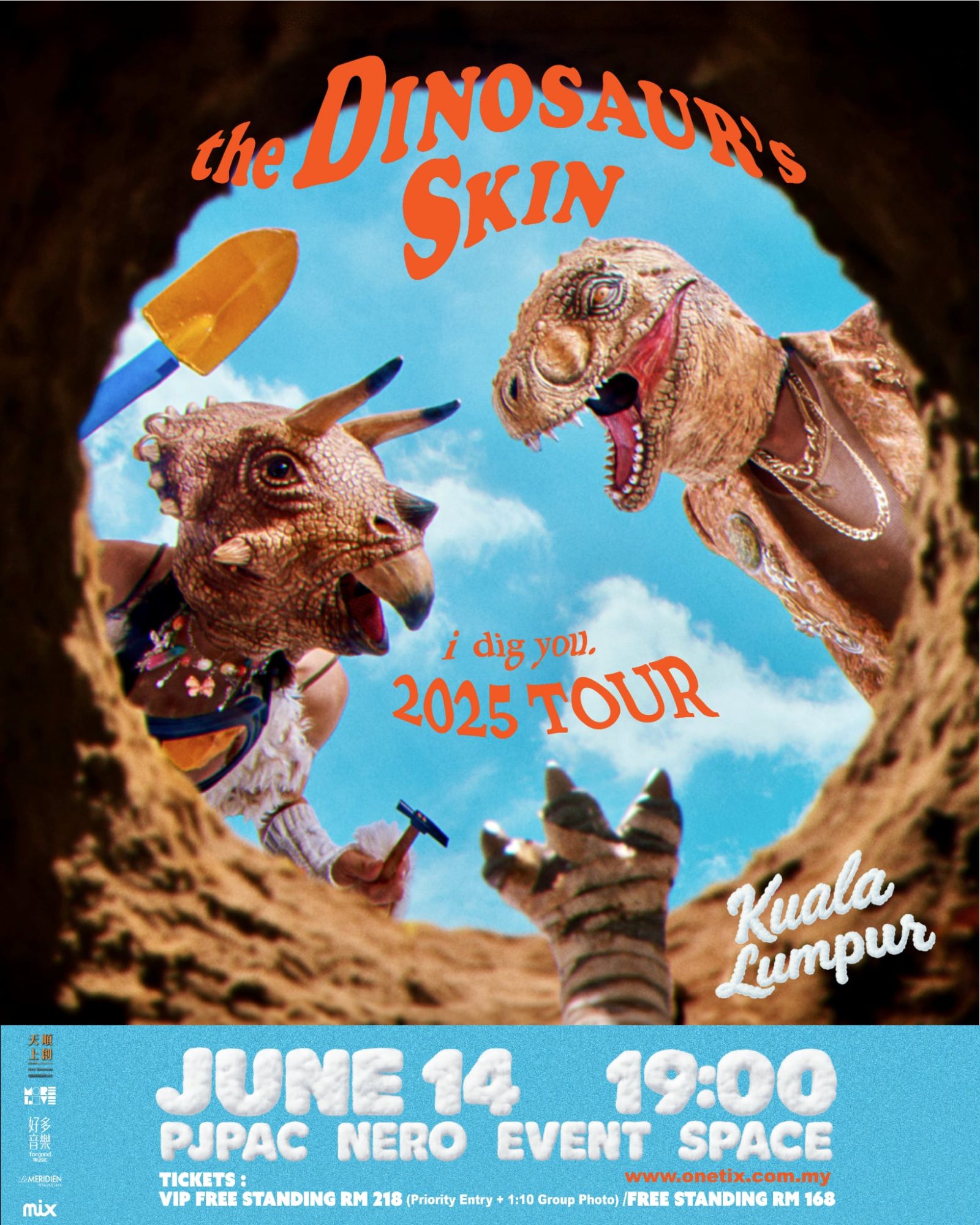 The Dinosaur’s Skin恐龙的皮《The Dinosaur’s Skin “I Dig You” 2025 TOUR》演唱会将在6月14日,晚上7时在PJPAC Nero Event Space举办,票价分为 218令吉(VIP站票,附优先入场及1:10合照福利)、168令吉(站票),官方购票网站为www.onetix.com.my。