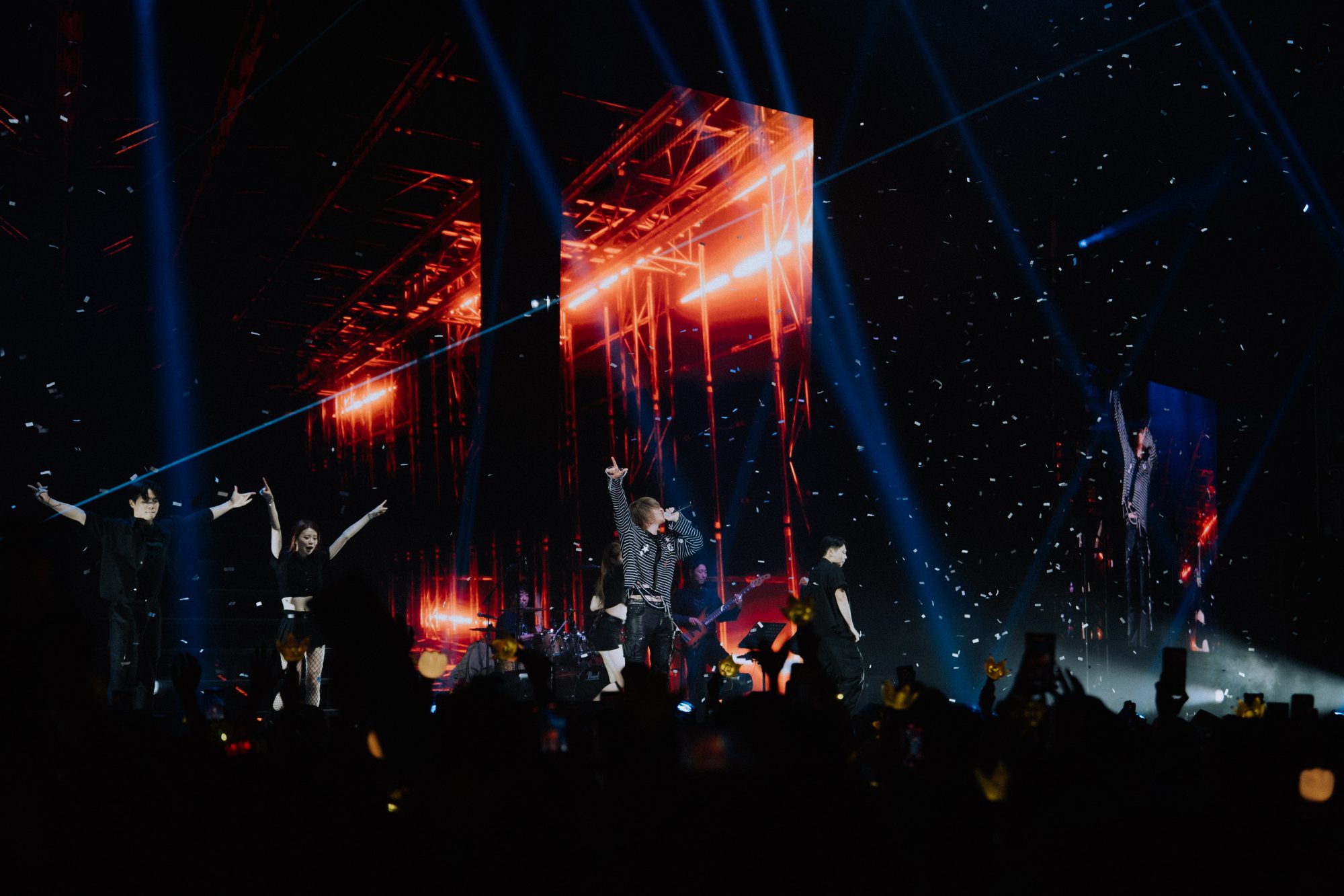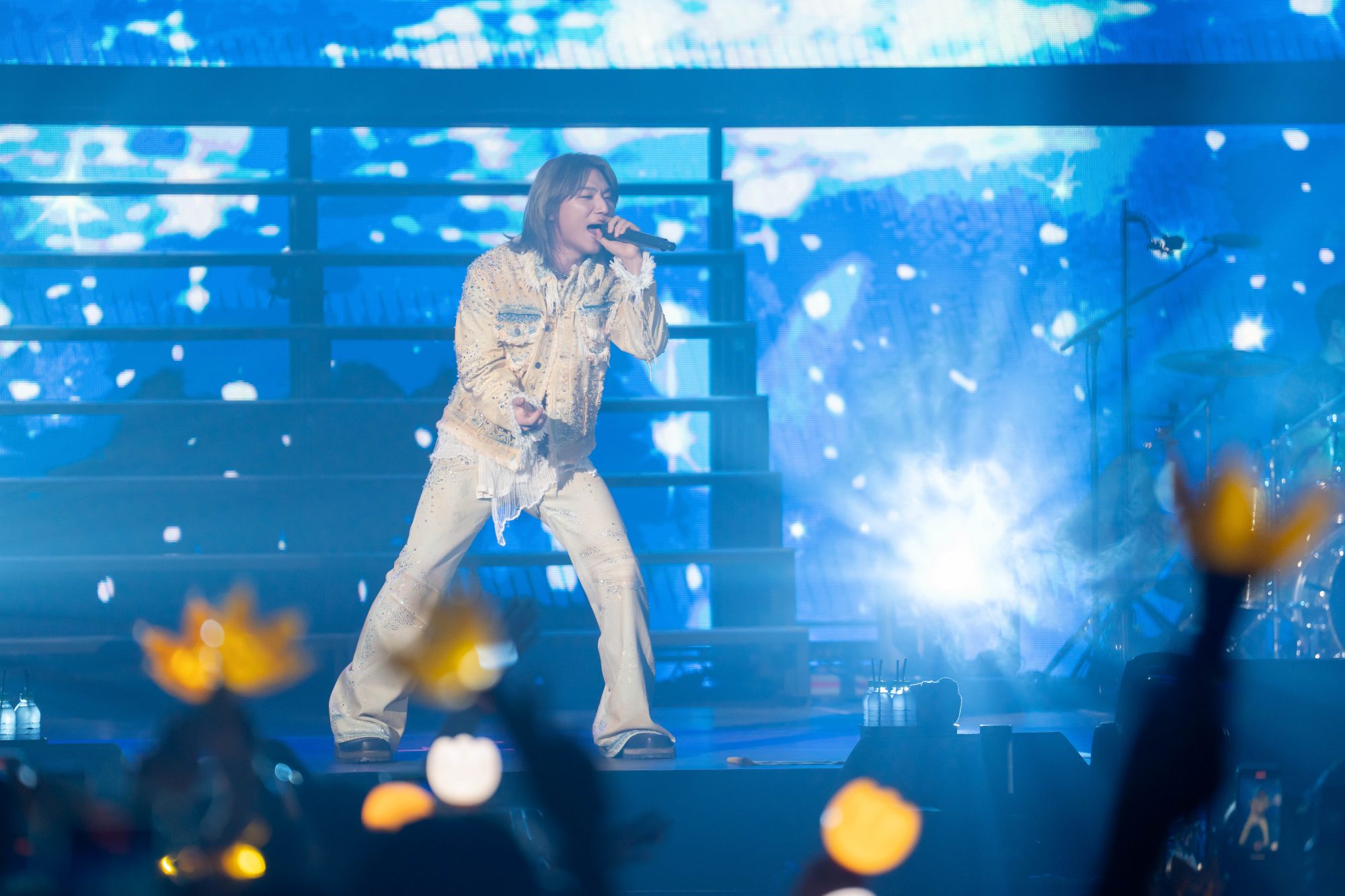 演唱会尚未正式开始,搭配的镭射灯光与 LED 视觉便已激发了粉丝的热情,全场自发大合唱,为这场魔幻之夜揭开序幕。当开场曲《Universe 》奏响,便引发了千人大合唱,火速炒热全场气氛,让姜大声感动不已!