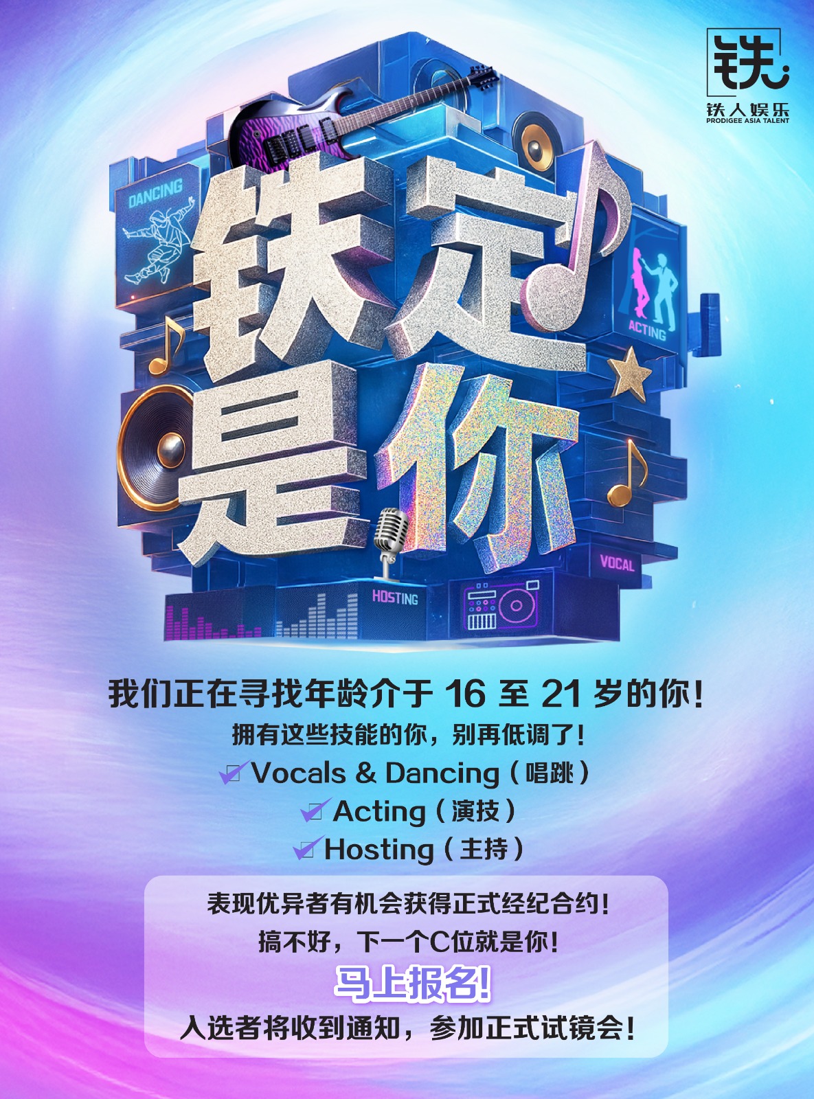 有意报名《铁定是你》可浏览铁人娱乐ProdigeeAsiaTalent官方脸书专页获取更多报名详情。