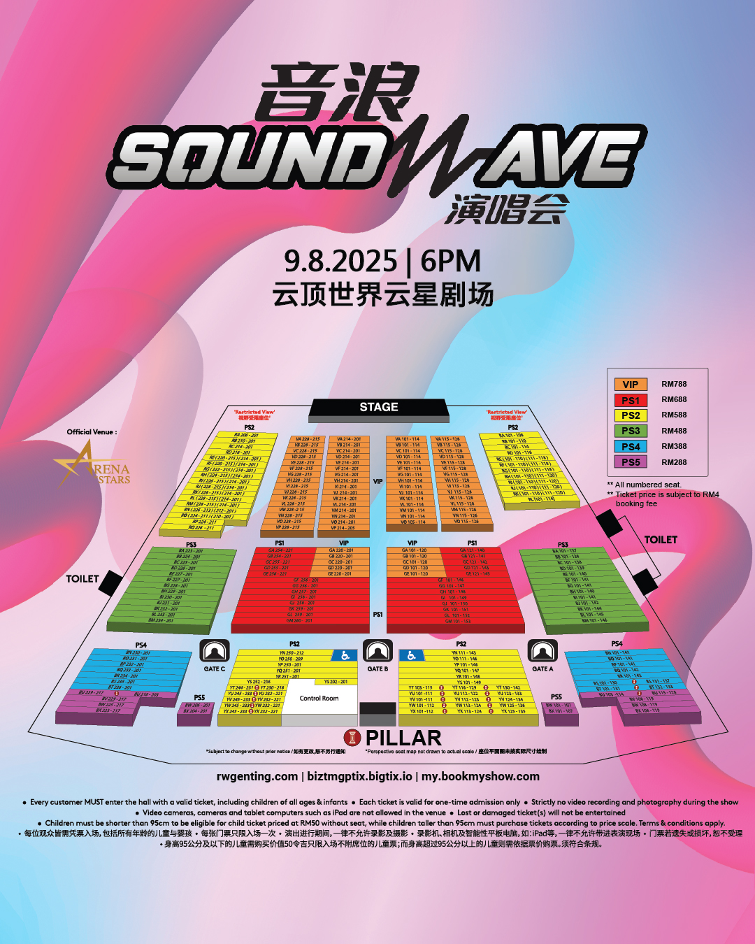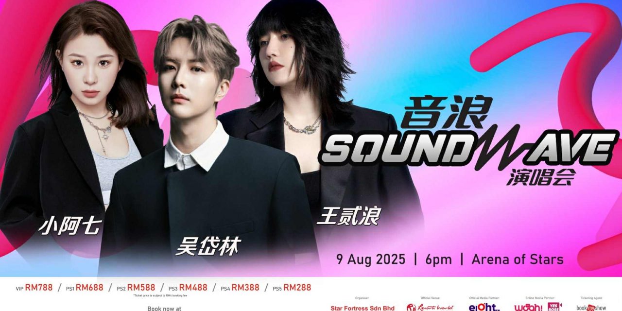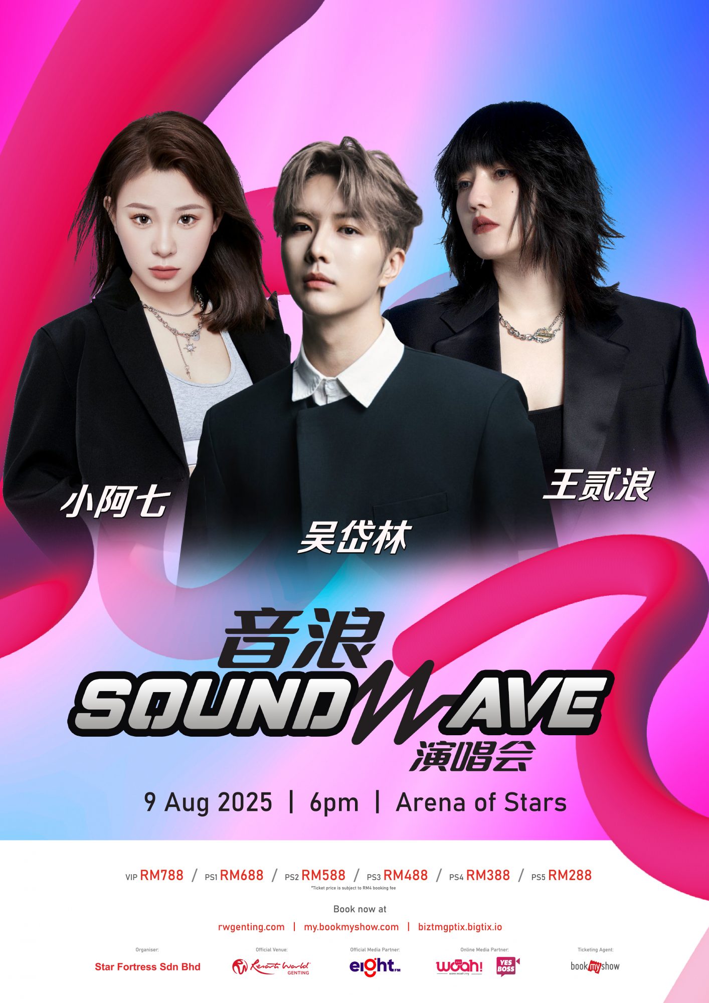 《⾳浪SOUNDWAVE演唱会2025》将于 2025 年 8 ⽉ 9 ⽇傍晚 6 点,在云顶世界云星剧场燃情开唱。⻔票将于 6 ⽉ 12 ⽇中午 12 点正式开售,票价分为 RM788(VIP)、RM688(PS1)、RM588(PS2)、RM488(PS3)、RM388(PS4)及 RM288(PS5)。更多购票详情请访问 rwgenting.com、biztmgptix.bigtix.io 及 my.bookmyshow.com。