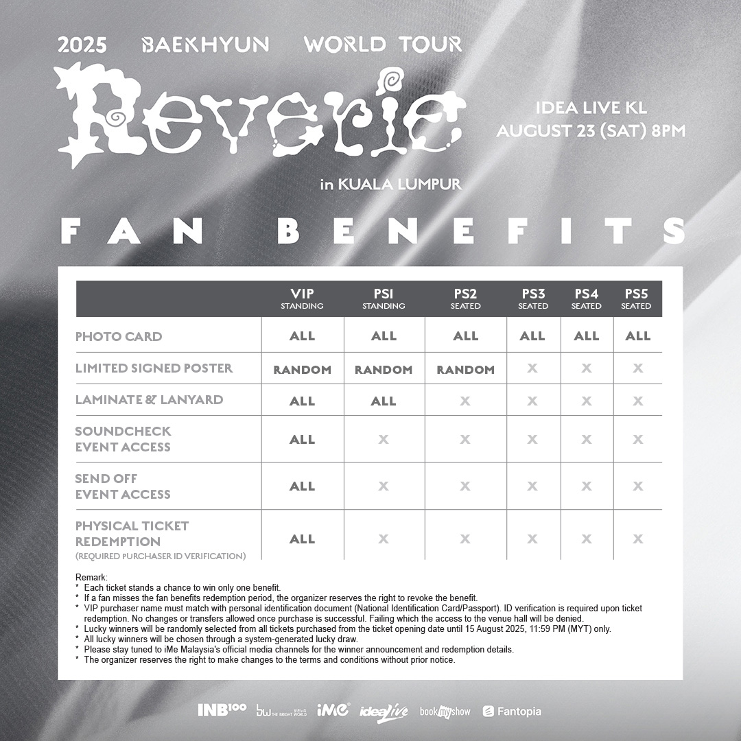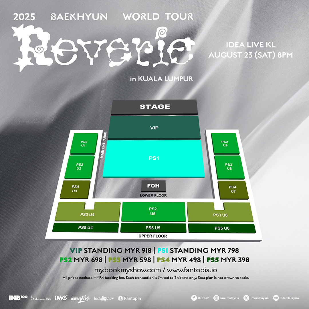由 iMe Malaysia 举办的《2025 BAEKHYUN WORLD TOUR < Reverie > in Kuala Lumpur》将于 2025 年 8 月 23 日(星期六),晚上 8 点,唱进 IDEA LIVE KL 。演唱会票价分为 (VIP 站席) MYR 918 、(PS1 站席) MYR 798 、(PS2坐席) MYR 698 、 (PS3坐席) MYR 598 、(PS4坐席) MYR 498 、(PS5坐席) MYR 398,门票不包括 RM 4 手续费用,每笔交易仅限购买 2 张门票。