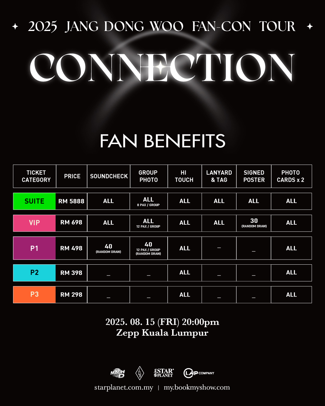 2025 张东雨《CONNECTION》FAN-CON巡演—吉隆坡站的门票,将于2025年6月20日,中午12时透过my.bookmyshow.com正式公开发售。丰富粉丝福利同步公开,包括签名海报抽选,合照环节以及彩排观摩(指定票价类别),官方限定小卡派发,精美挂绳和特定设计的随行者等。