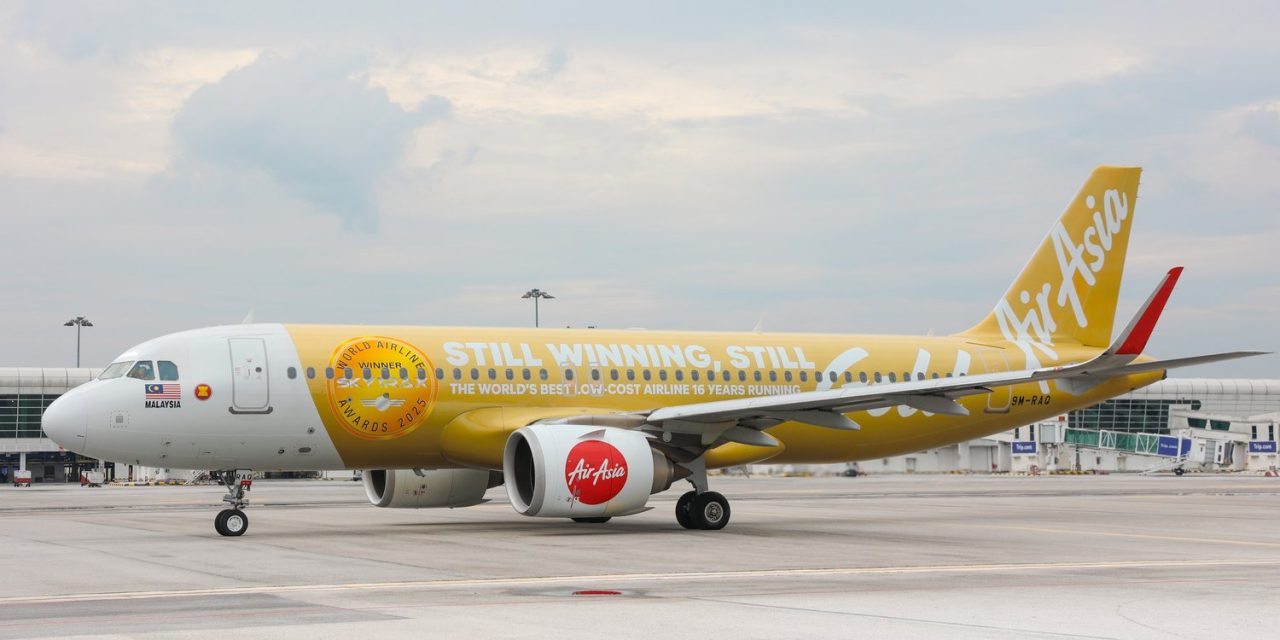 亚航为庆祝其在2025年 Skytrax 世界航空大奖中蝉联第16次‘世界最佳低成本航空公司’的胜利,推出了引人注目的全金色飞机涂装,展现其辉煌的成就。