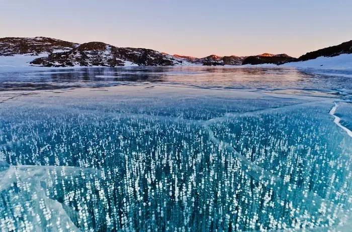 千里的冰地里透着魅惑的蓝,湖面上的冰痕纵横交错,无数渴望冒出地面的泡泡被凝固…站在冬天的贝加尔湖畔,仿佛一个地下的银河系就近在咫尺!