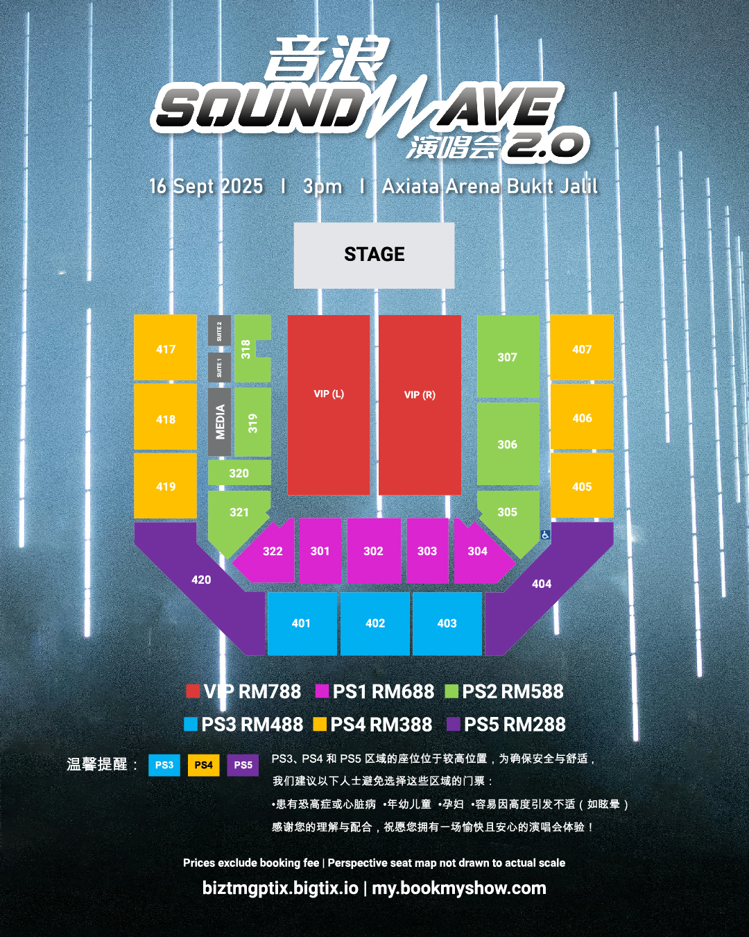 《⾳浪 SOUNDWAVE 2.0 演唱会 2025》将于 2025 年 9 ⽉ 16 ⽇下午 3 点,在 Axiata Arena Bukit Jalil 燃情开唱。⻔票将于 6 ⽉ 26 ⽇中午 12 点开启预售;6 ⽉ 27 ⽇中午 12 点正式开售,票价分为 RM788(VIP)、RM688(PS1)、RM588(PS2)、RM488(PS3)、RM388(PS4)及 RM288(PS5)。