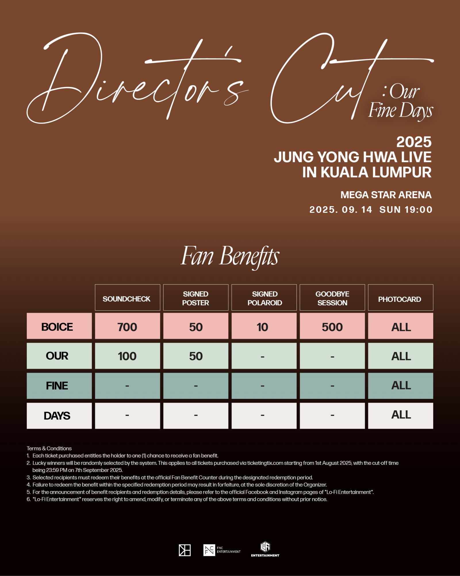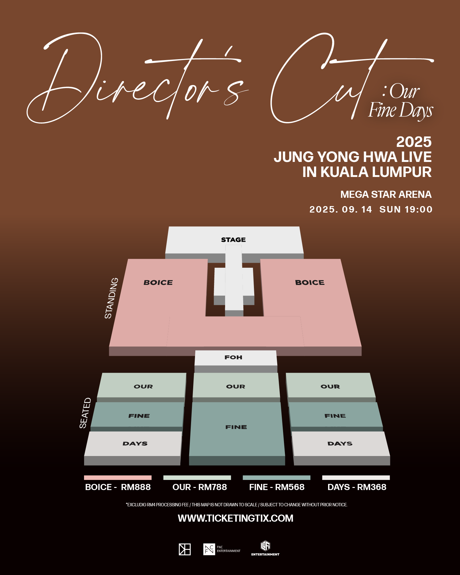 由Lo-Fi Entertainment主办的《2025 JUNG YONG HWA LIVE ‘Director’s Cut: Our Fine Days’》吉隆坡站演唱会,将于9月14日(星期日)晚上7点,在Mega Star Arena, KL盛大登场,本次演唱会恰逢郑容和个人出道十周年及推出的第三张迷你专辑《One Last Day》。他将以标志性的舞台魅力、感染力十足的声线,以及充满魅力舞姿,为粉丝呈现一场视听兼备的音乐盛宴。