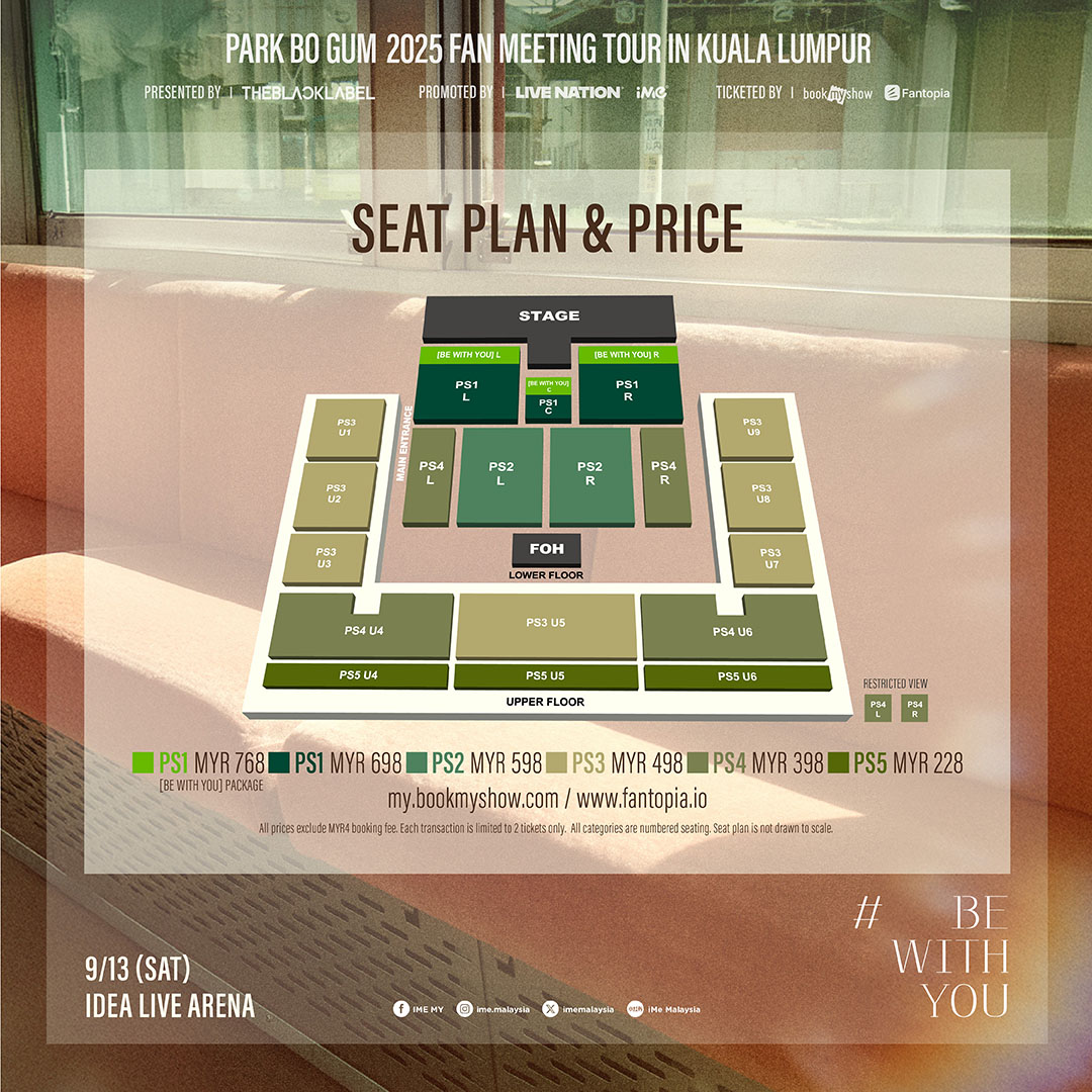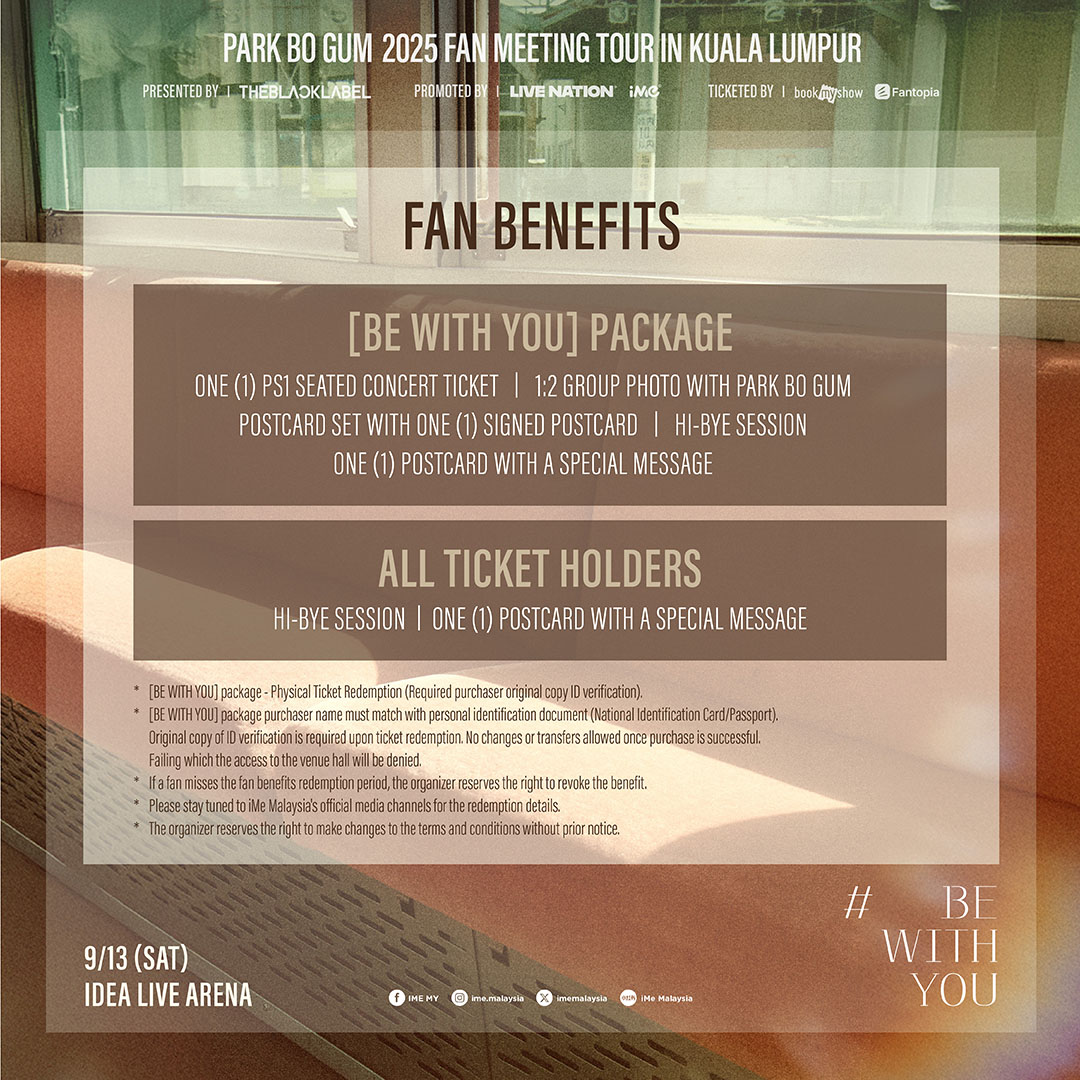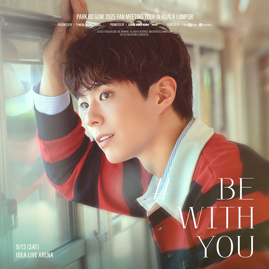 PARK BO GUM 2025 FAN MEETING TOUR [BE WITH YOU] IN KUALA LUMPUR 门票将于 7月15日(星期二)中午12时起,通过官方售票平台 Book My Show 和 Fantopia 公开发售。
