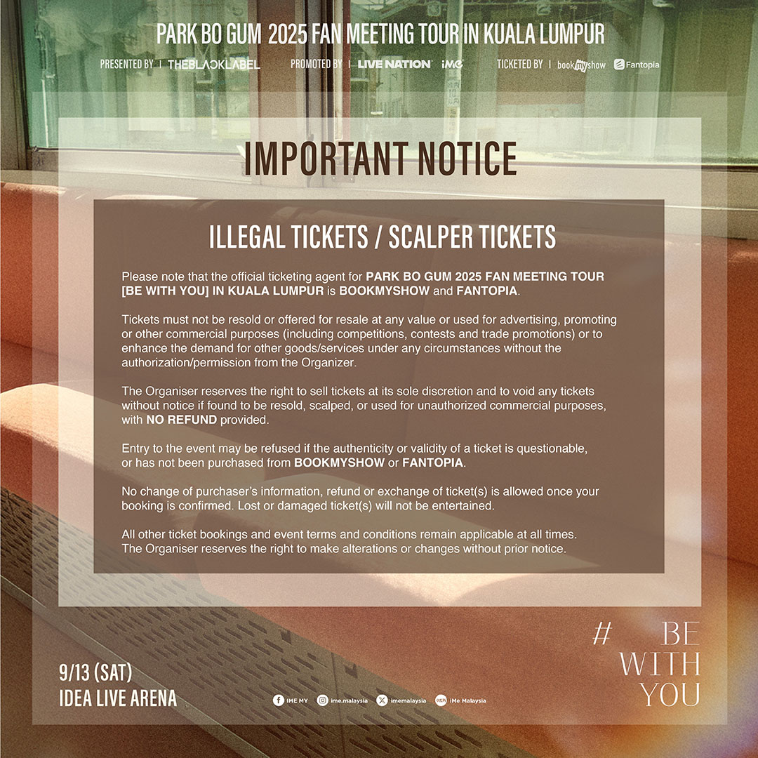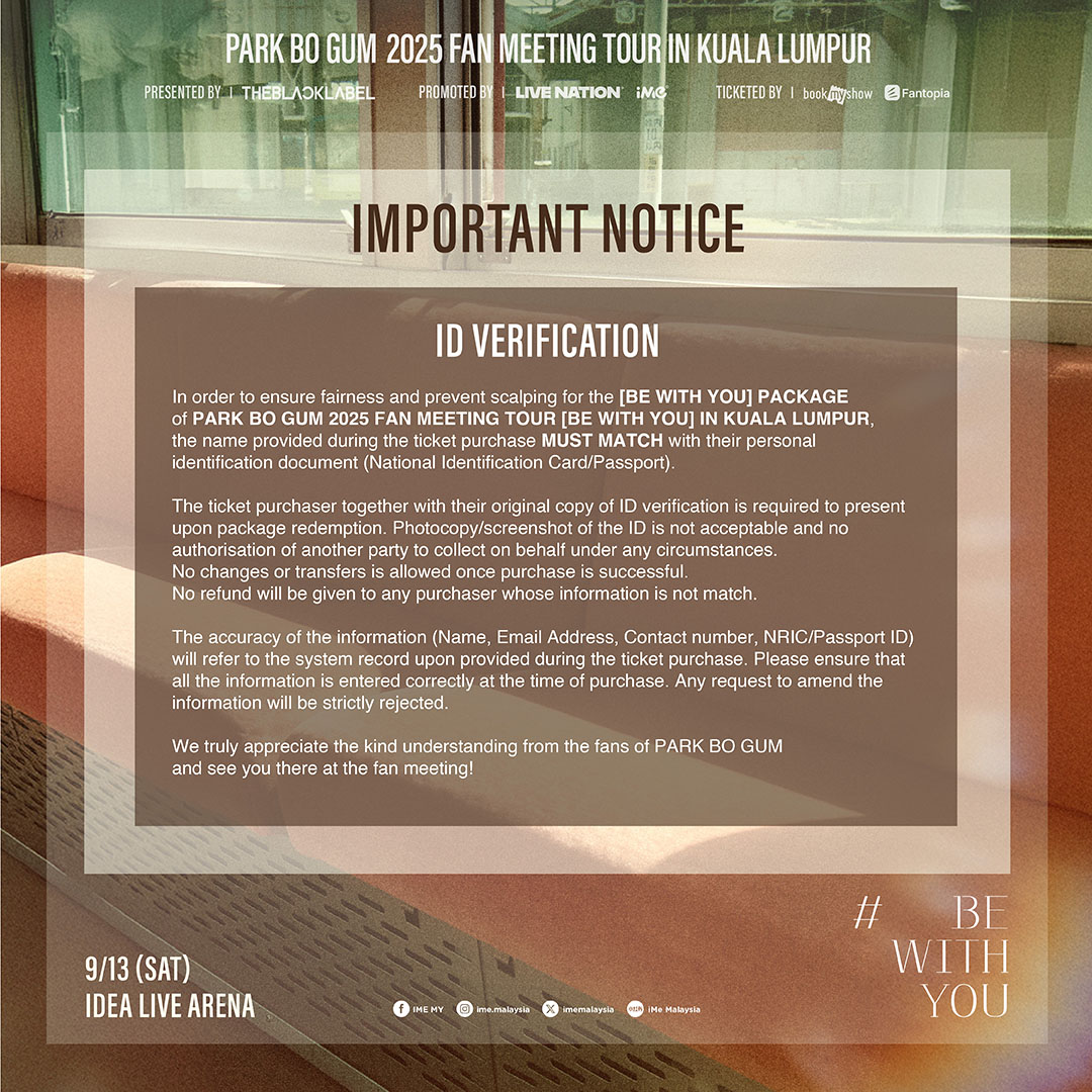 主办单位 iMe Malaysia 呼吁大马粉丝请勿从非官方售票处或向他人购买门票以免受骗。为确保购票公平性及杜绝黄牛票行为,凡购买 BE WITH YOU 套票的粉丝需要填写的有效资料,并在兑换福利时出示身份证明以供核实。