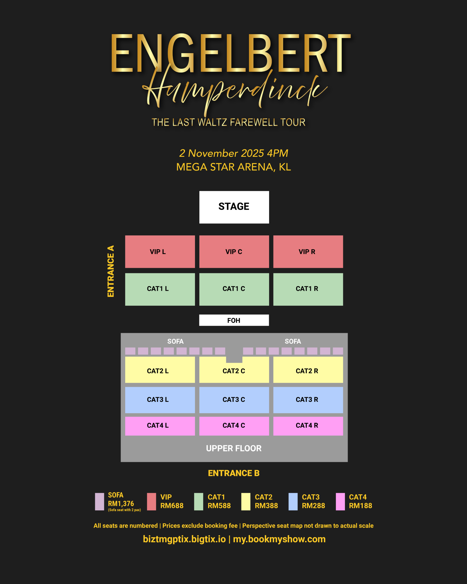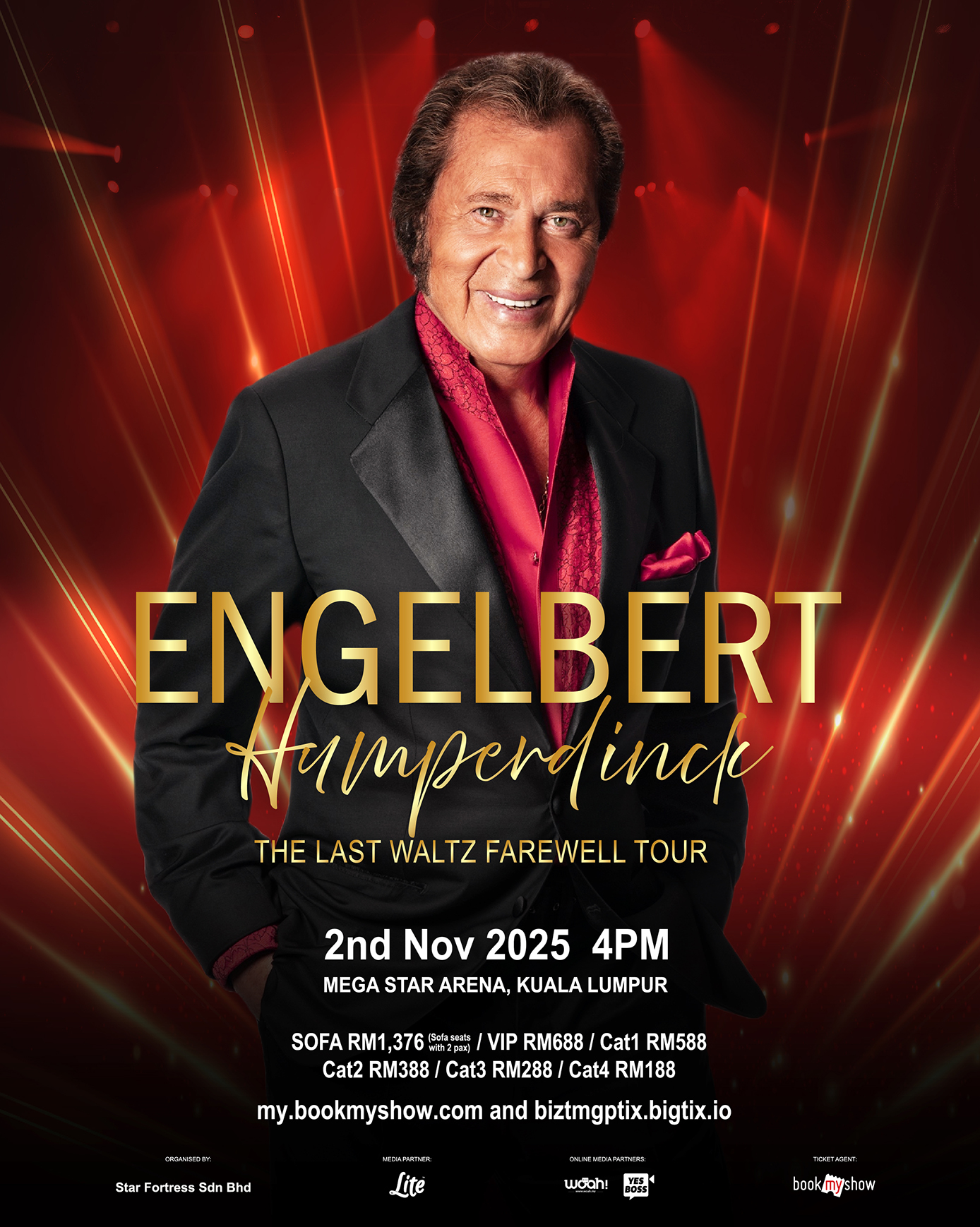 Engelbert Humperdinck《The Last Waltz Farewell Tour》吉隆坡站将于11月2日(星期日),下午4时在Mega Star Arena盛大开唱,门票分为1376令吉(双人沙发座)、688令吉(VIP)、588(CAT 1)、388令吉(CAT 2)、288令吉(CAT 3)及188令吉(CAT 4)。门票将于8月1日早上10点正式公开发售,欲知更多购票详情, 请浏览官方售票网站 biztmgptix.bigtix.io 及 my.bookmyshow.com 查询。