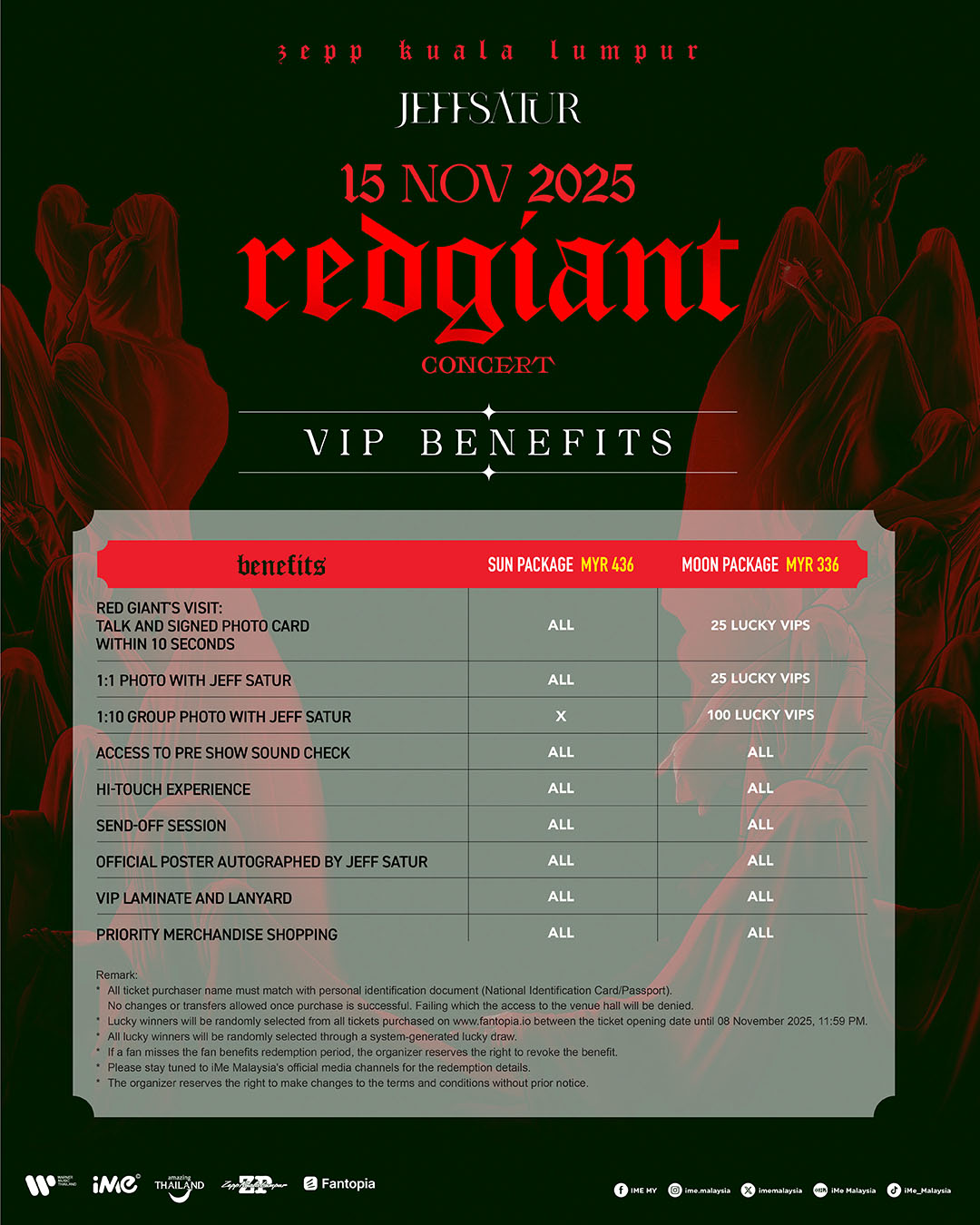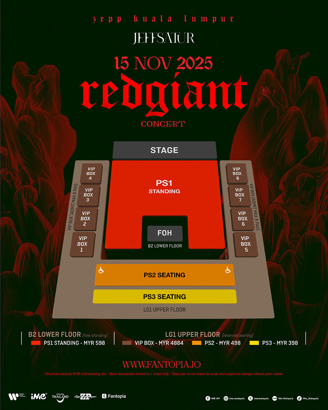 JEFF SATUR RED GIANT TOUR 2025 KUALA LUMPUR 门票将于 8 月 5 日(星期二)中午 12 时起,通过官方售票平台 FANTOPIA(https://www.fantopia.io/)公开发售。主办单位呼吁粉丝请勿从非官方渠道购票,以防受骗。为确保购票公平性及杜绝黄牛行为,此次演出将采取实名制购票及入场核验机制。