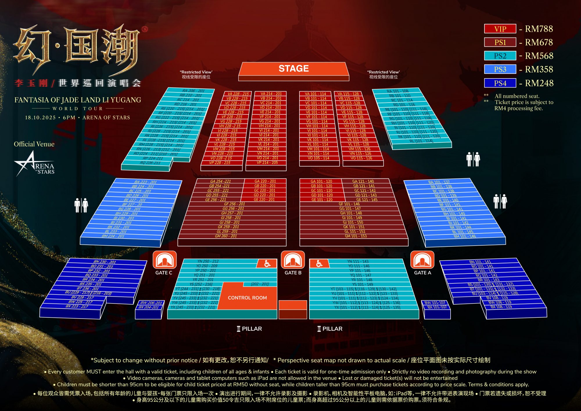 《幻国潮·李玉刚世界巡回演唱会》马来西亚站门票将于 2025 年 8 月 11 日中午 12 时开放给云顶云尊金卡及以上的会员透过云顶世界官方网优先购买,公众售票则于 2025 年 8 月 18 日中午 12 时开售。票价格分为 788 令吉(VIP)、678 令吉(PS1)、568 令吉(PS2)、358 令吉(PS3)及 248 令吉(PS4),所有票价未包含 RM4 手续费。凡通过云顶积分、信用卡或现金购票的云顶云尊卡会员将获得 10%折扣, 仅适于VIP、PS1 及 PS2 票位。欲了解更多详情,请浏览网站 rwgenting.com。