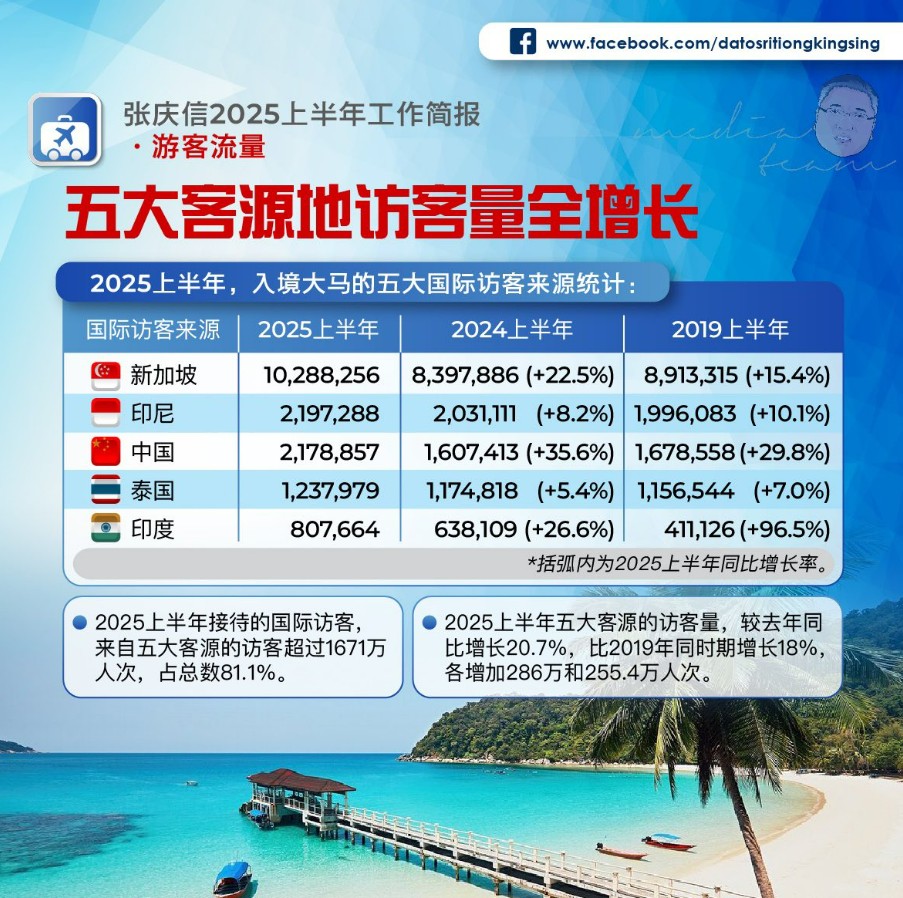 旅游、艺术及文化部长拿督斯里张庆信办公室发布“#部长2025上半年部门工作进度简报”资料显示,上半年来马访客量前5的国家依次是新加坡、印尼、中国和泰国,以及成功以80.7万人次首度入榜的印度。当中,访客量首度突破千万的新加坡(1028.8万人次),以及首度突破200万的中国(217.8万人次)也双双迈向新里程碑。