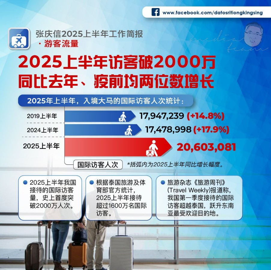 我国今年首6个月国际访客量突破2000万人次,创上半年有史以来最多国际访客入境大马记录,较2024年和疫情前2019年分别同比增长17.9%和14.8%,相较去年上半年的旅游收入,保守估计将额外进账87.8亿令吉。