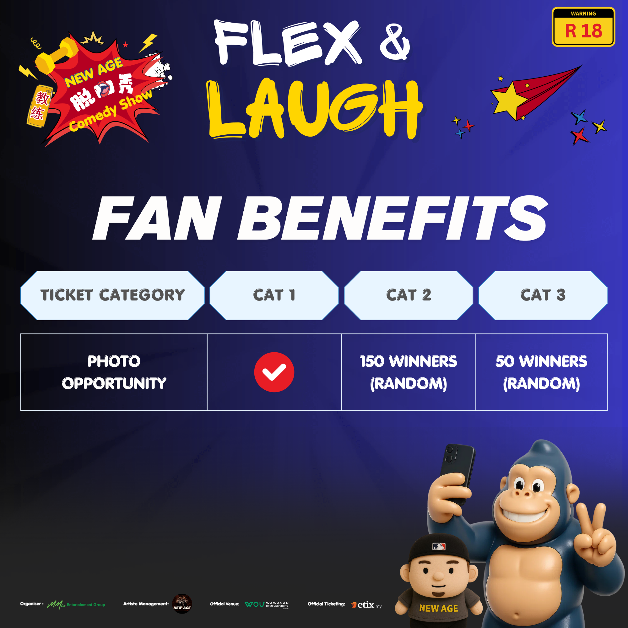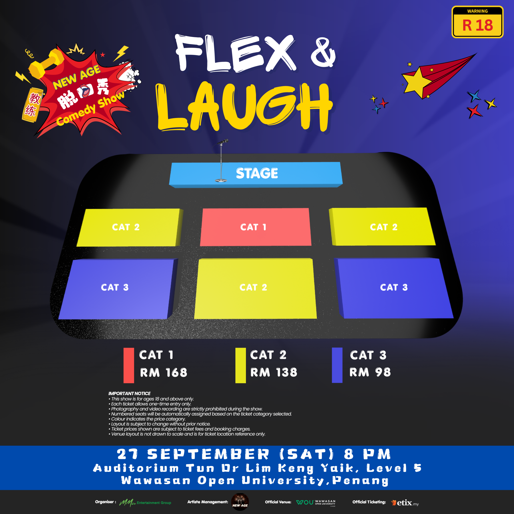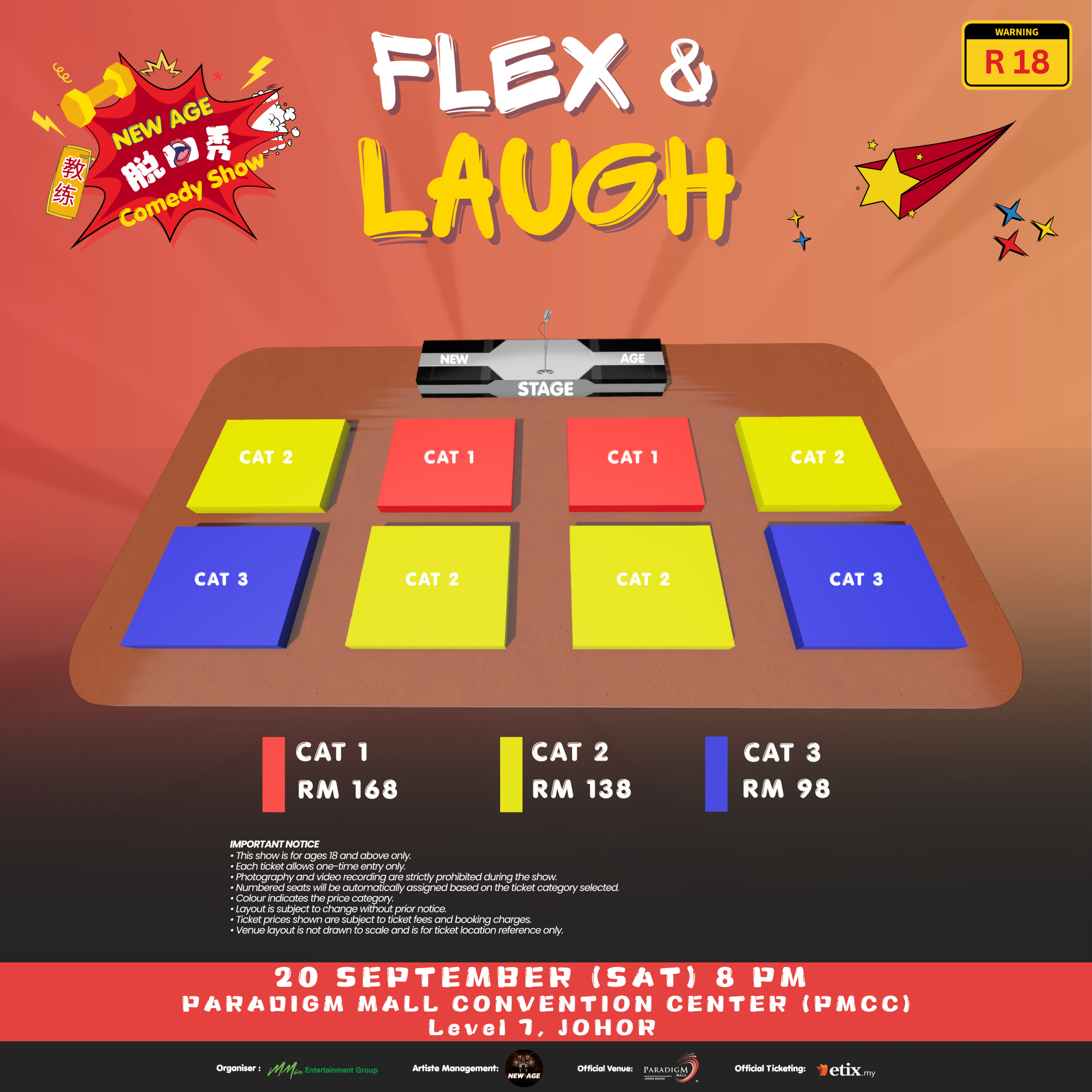 由 MMIC 娱乐主办的《New Age “Flex & Laugh” Comedy Show》脱口秀,将于9月20日(星期六) 在柔佛新山Paradigm Mall Convention Center, Level 7以及9月27日(星期六) 在槟城 Auditorium Tun Dr Lim Keng Yaik, Level 5 Wawasan Open University晚上八时爆笑登场。