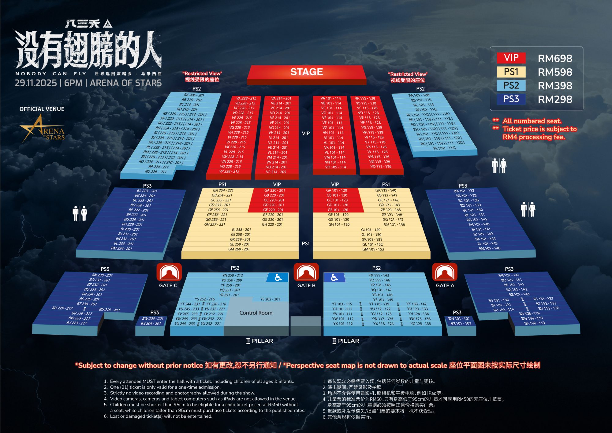 票价格分为 698 令吉(VIP)、598 令吉(PS1)、398 令吉(PS2)及 298 令吉(PS3),所有票价未包含 RM4 手续费。欲了解更多详情,请浏览网站 rwgenting.com。