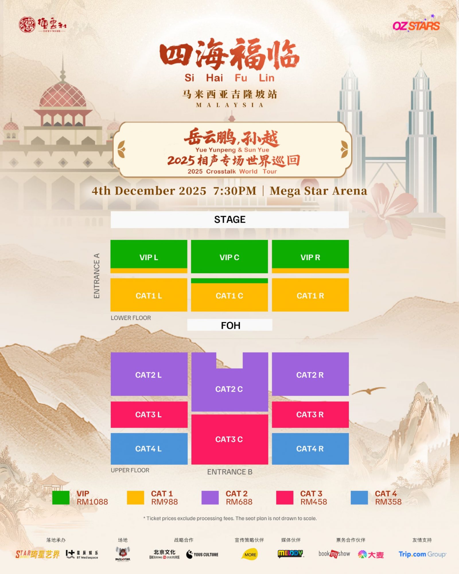 岳云鹏、孙越《四海福临2025相声专场》世界巡演—吉隆坡站,将于12月4日(星期四),晚上7时30分在Mega Star Arena举办。票价分为RM1088(VIP)、RM988(CAT 1)、RM688(CAT 2)、RM458(CAT 3)及RM358(CAT 4),门票将于9月30日(星期二)中午12时,正式通过 my.bookmyshow.com 和大麦票务全面开售。