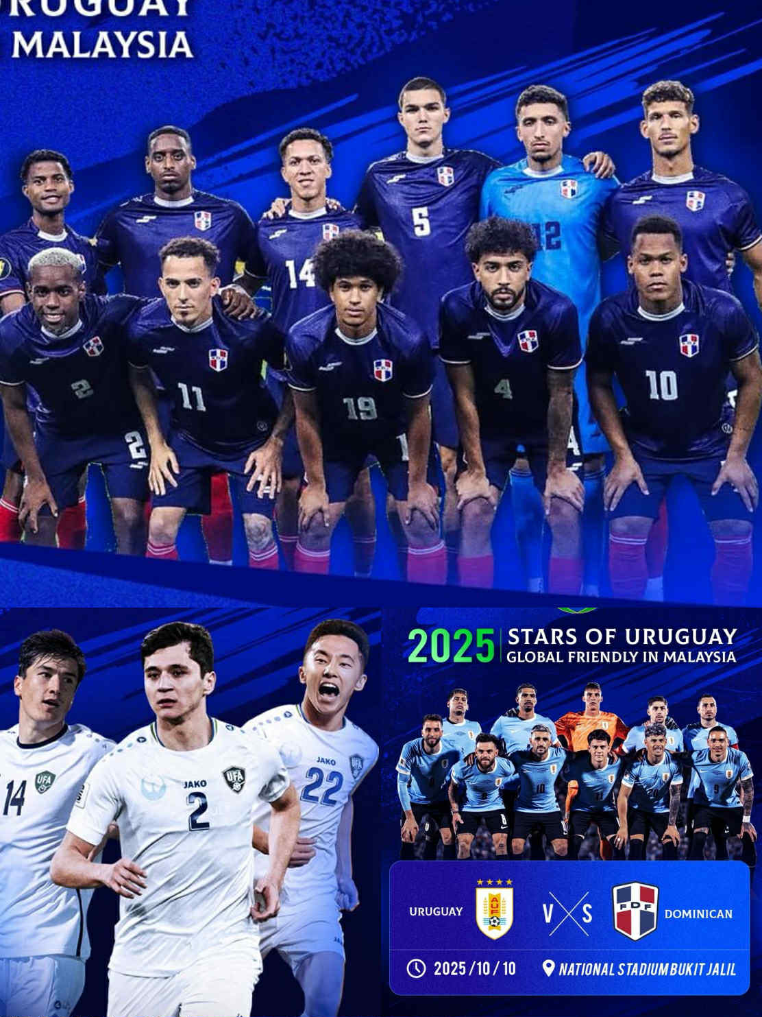 南美洲顶尖足球劲旅即将来马开战, 乌拉圭国家队 将于 10月10日 在 武吉加里尔国家体育场(National Stadium Bukit Jalil) 迎战多米尼加共和国队(Dominican),随后于 10月13日 转战 马六甲 Hang Jebat 体育场对阵乌兹别克斯坦队(Uzbekistan)。
