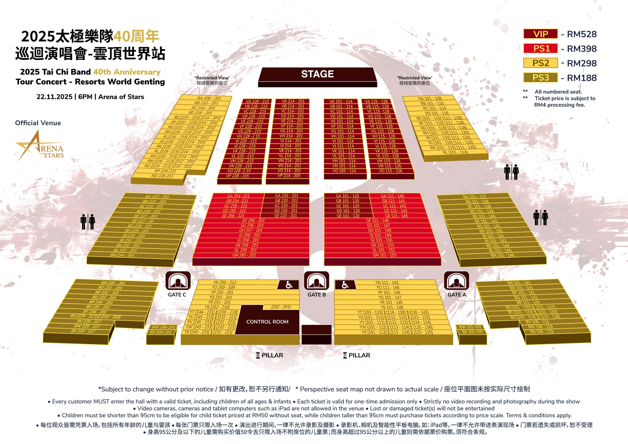 《2025 太極樂隊 40 周年巡迴演唱會 – 雲頂世界站》演唱会票价格分为 528 令吉(VIP)、398 令吉(PS1)、298 令吉(PS2)及 188 令吉(PS3),所有票价未 包含 RM4 手续费。欲了解更多详情,请浏览网站 rwgenting.com。