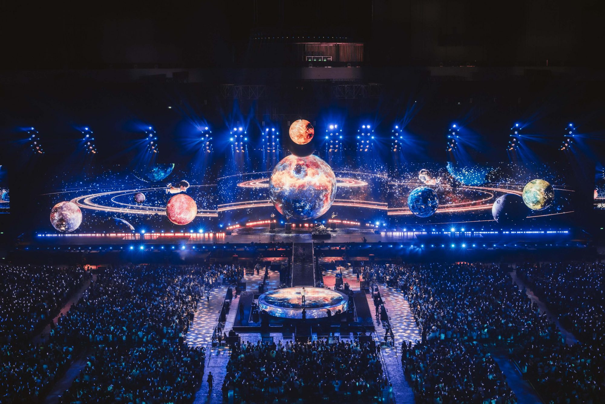 本次巡演倾力打造,再度呈现 「5懈可击」 的顶级音、光、影盛宴。以 「时间胶囊」 为创作核心,全新巨型主舞台——「天外有天·时光机」 震撼亮相。舞台由超过 15,000 片特制三维曲面 LED 屏精心组合,搭配 Disguise 多媒体系统,呈现媲美16K画质的沉浸式视觉体验。现场还设有五颗漂浮装置 「神的孩子都在跳5球」 延伸舞台视觉,营造出极具未来感与空间层次的视觉奇观。