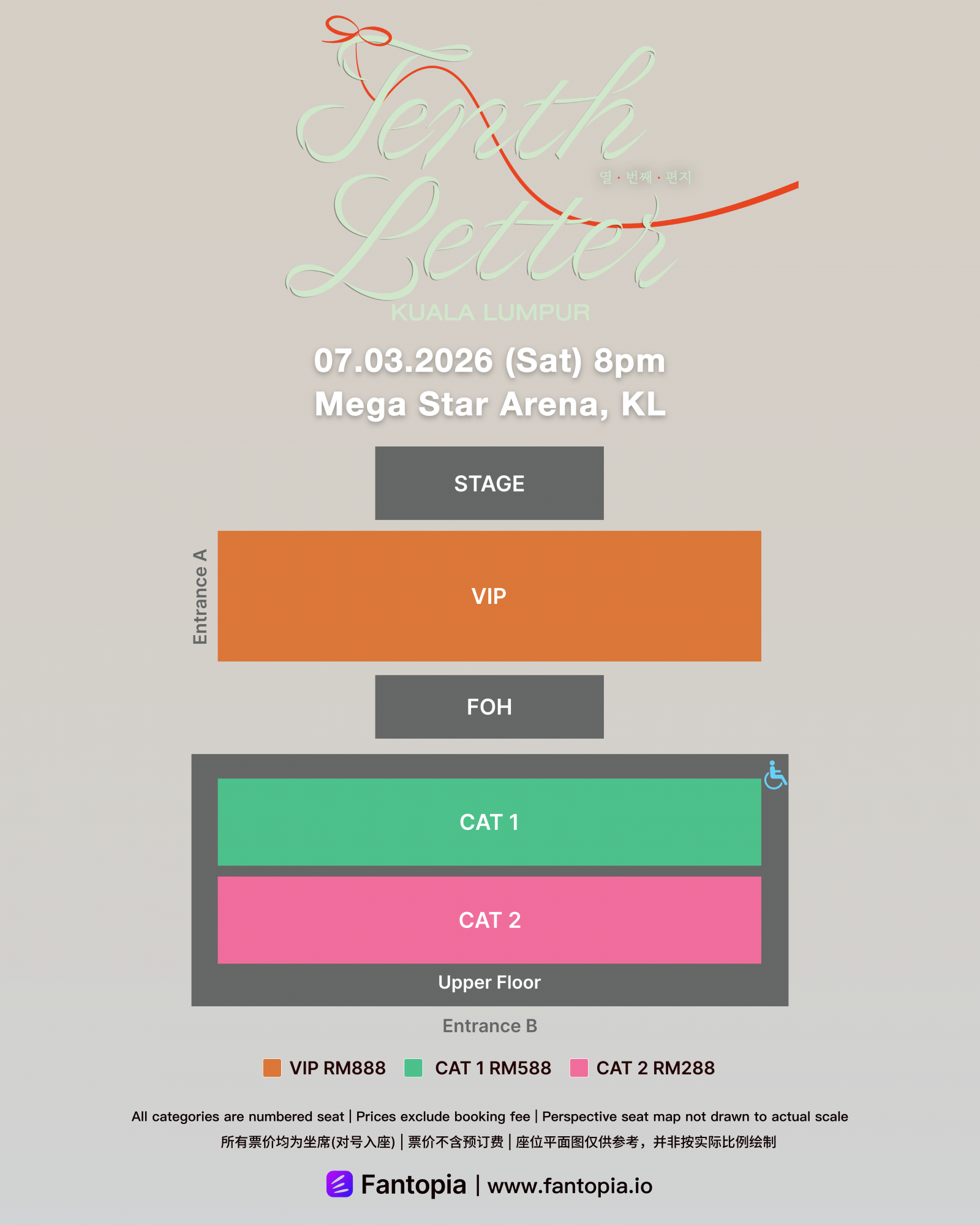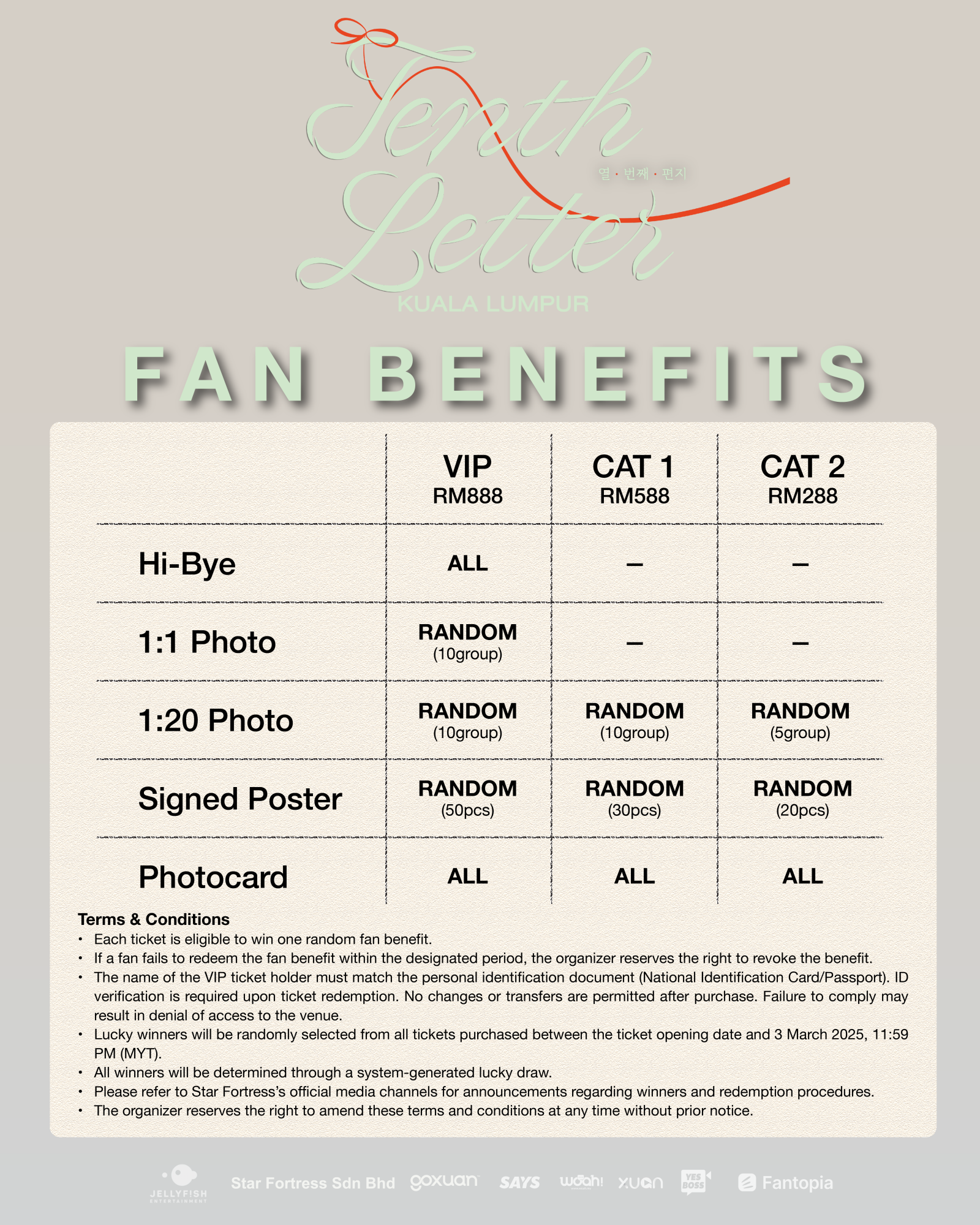 吉隆坡站⻔票票价包括RM888(VIP)、RM588(CAT 1)以及 RM288(CAT 2)。所有⻔票均可参与粉丝福利抽选,有机会获得Hi-Bye 问候、1:1 合照、1:20 合照、签名海报或限定 Photocard 等不同福利。粉丝福利将以随机⽅式抽出,每张⻔票仅会享有对应⼀项福利。