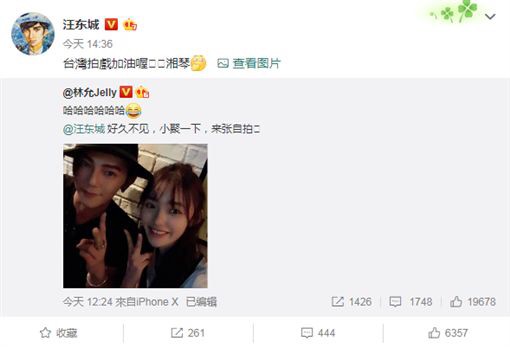汪东城晒和林允的合照,喊对方“湘琴”。
