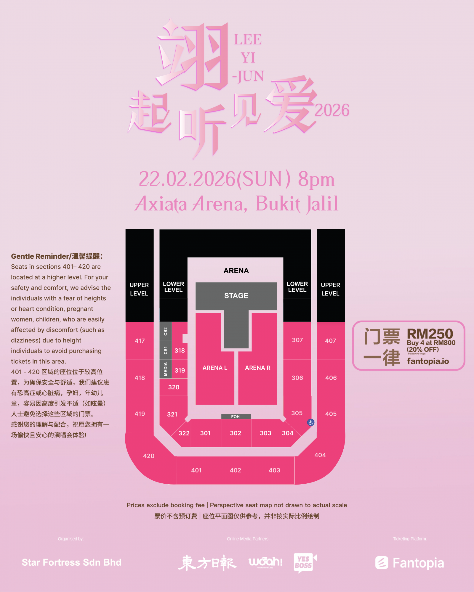 演唱会⻔票将于2025 年 12 ⽉ 12 ⽇(星期五)中午12 点整,通过官⽅指定平台 Fantopia 全⾯开售!为感谢⼴⼤歌迷⻓久以来的⽀持,本次票价设定亲⺠统⼀,均为 RM250。更推出超值“团聚共享”套票优惠:⼀次性购买 4 张⻔票,即可⽴即享受总价 20%的折扣,邀您与⽣命中重要的⼈共赴这场⾳乐之约。