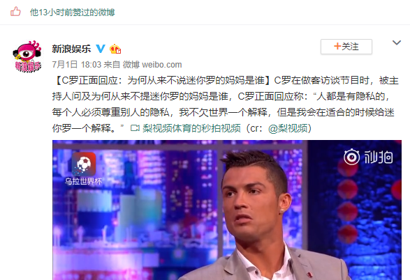 陈坤点赞C罗回应儿子生母微博 呼吁重视他人隐私 2 Jul , 2018 | 娱乐前线 陈坤昨天被网民发现点赞了一条C罗回应儿子生母的微博。据悉,该微博讲述了C罗在做客访谈节目时,被主持人问及为何从来不提迷你罗的妈妈是谁的事,C罗正面回应称:“人都是有隐私的,每个人必须尊重别人的隐私,我不欠世界一个解释,但是我会在适合的时候给迷你罗一个解释。” 网友纷纷表示:“尊重隐私!保护孩子!”“这是个人的家事,没必要揪着不放,支持维护隐私!”“尊重别人的隐私吧!” 分享