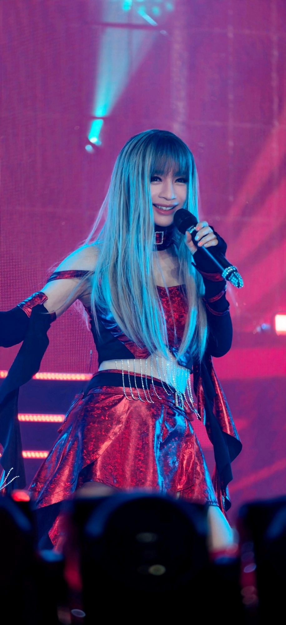 来到尾声高潮,钟洁希以“赤焰公主”造型震撼亮相!她换上红色短裙搭配露肩、露脐与低胸设计,随着外套卸下,全场尖叫声瞬间爆棚,气氛被彻底点燃,将演唱会推向最高潮。