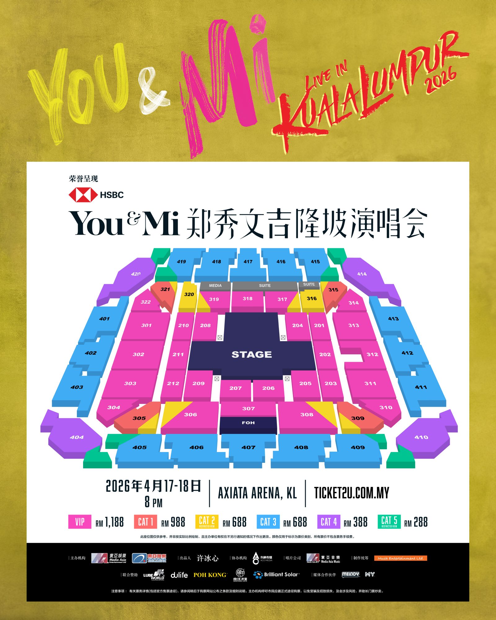 《You & Mi 郑秀文吉隆坡演唱会 2026》将于 2026 年 4 月 17 日及 18 日 晚上 8 点,在吉隆坡Axiata Arena Bukit Jalil隆重开唱。这也是郑秀文首次登上Axiata Arena的舞台。