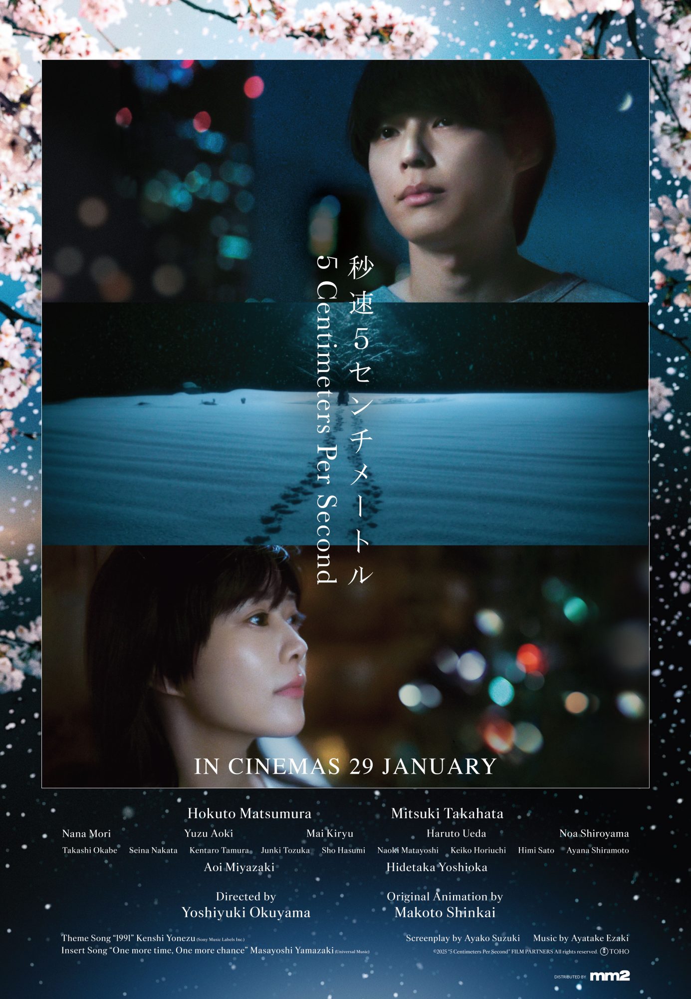 真人版《秒速五厘米》由曾为《铃芽之旅》献声的松村北斗饰演男主角远野贵树,新海诚更曾公开称赞他是“最值得信赖的演员”。松村北斗此次在片中饰演成年的远野贵树,而女主角则由实力派演员高畑充希出演,她在片中饰演成年的篠原明里。两人生动的表演为这部经典又触动人心的爱情故事注入爱、等待与放手的微妙情感。