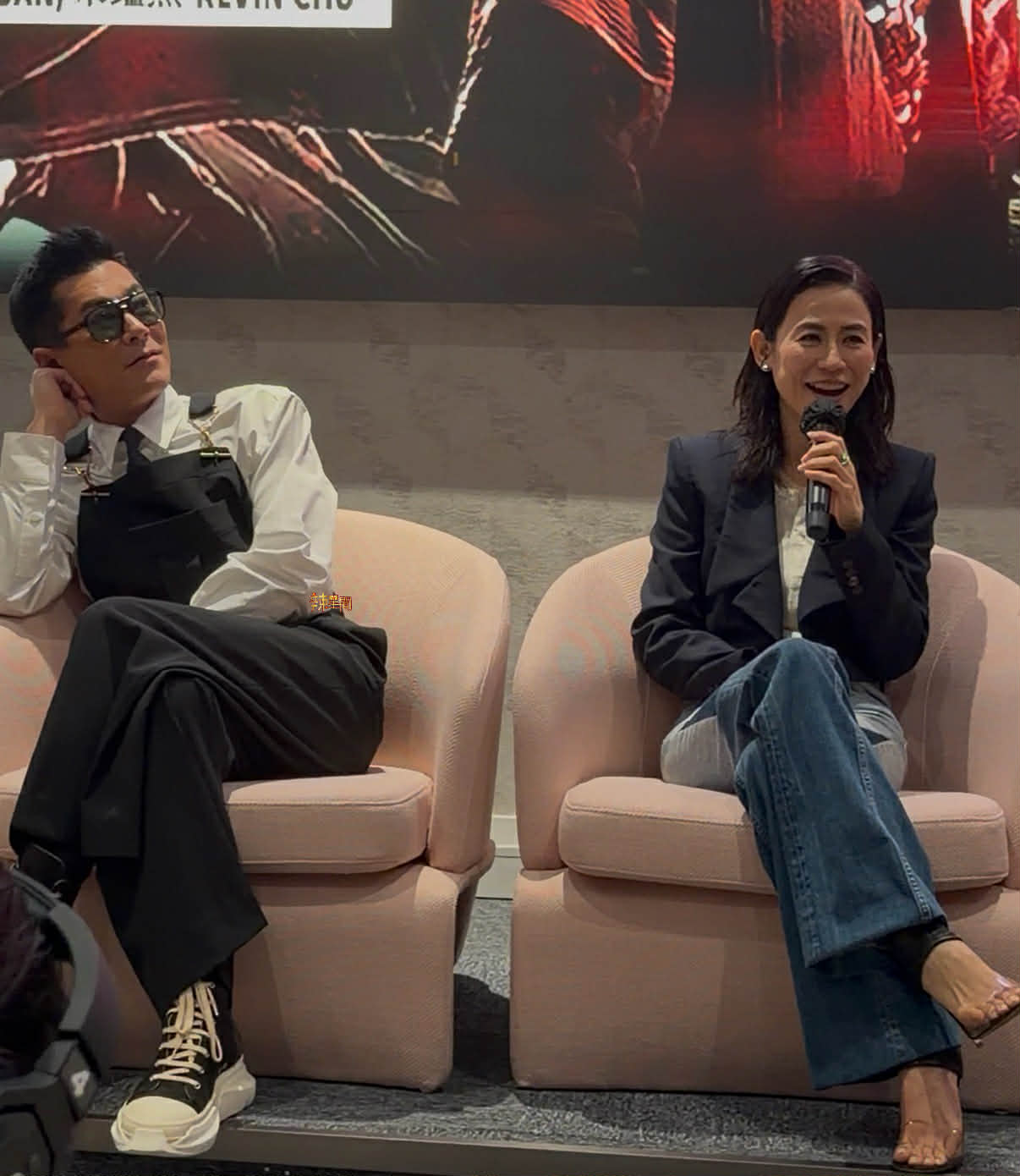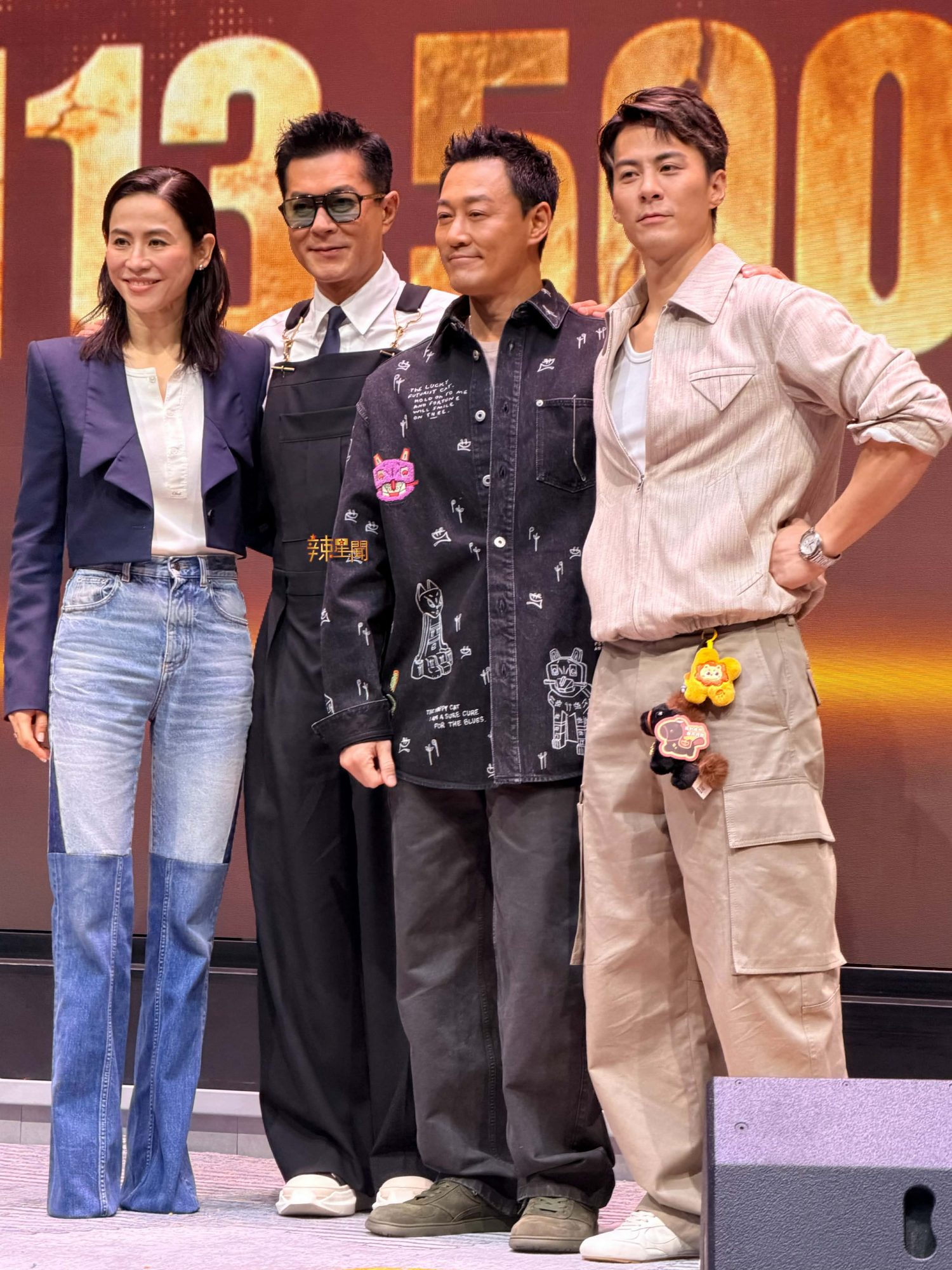 古天乐、宣萱、林峯和朱鉴然跟片商开心捞生,期间古天乐超调皮瞬间回到“古3岁”开心玩起来,尤其让身边的宣萱露出惊吓表情,而朱鉴然也不时拿起手机拍摄记录当下Moment,气氛相当热闹,搞笑的是,林峯在台上形容庆功宴现场很像婚礼现场,“非常高兴在这个婚宴跟大家见面!(主持人:谁跟谁的婚宴?)我和他(指)朱鉴然!”