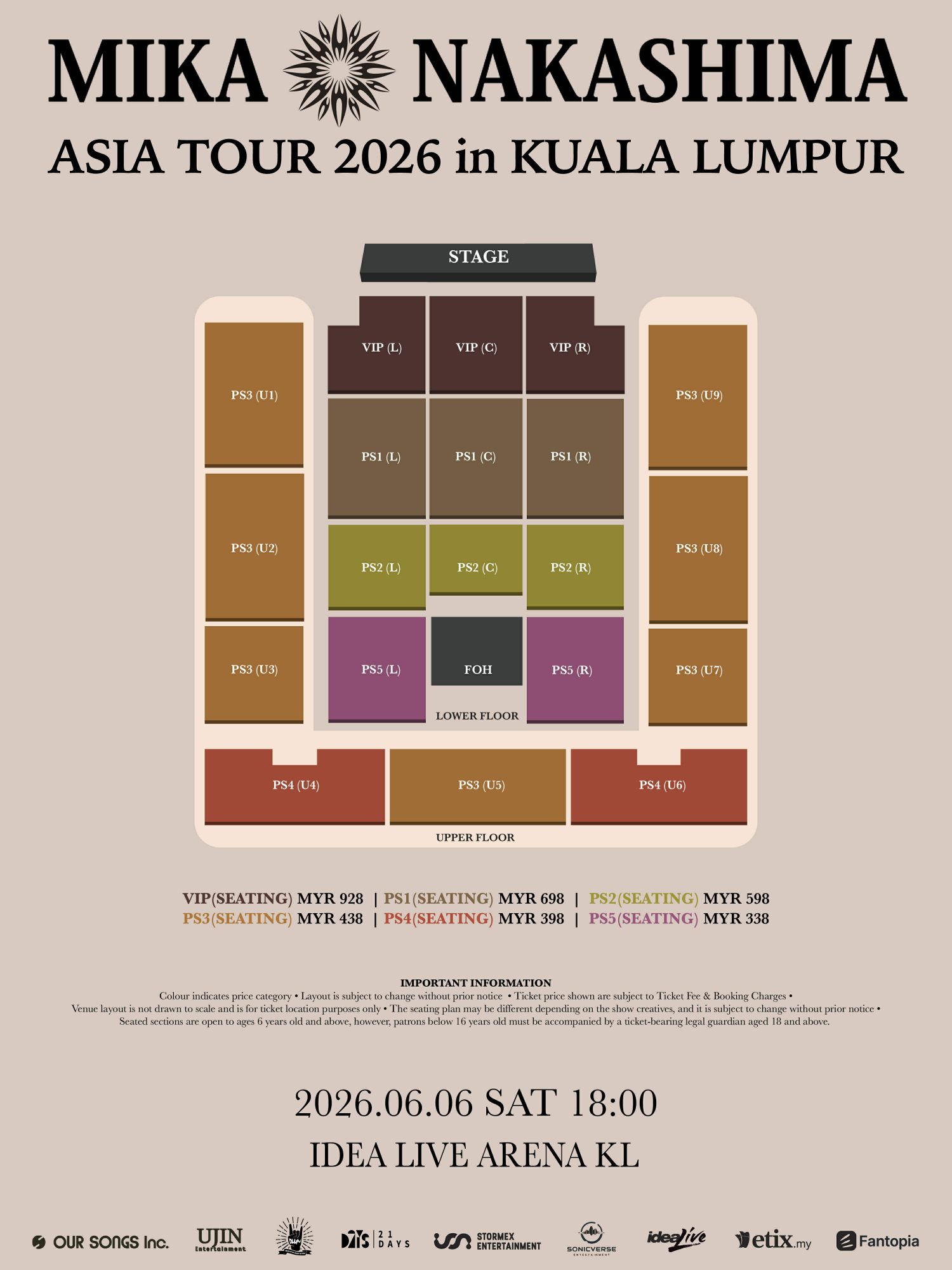 票价分别为 RM338、RM398、RM438、RM598、RM698 及 RM928(所有票价均不包含订票手续费),每笔交易限购4张门票。