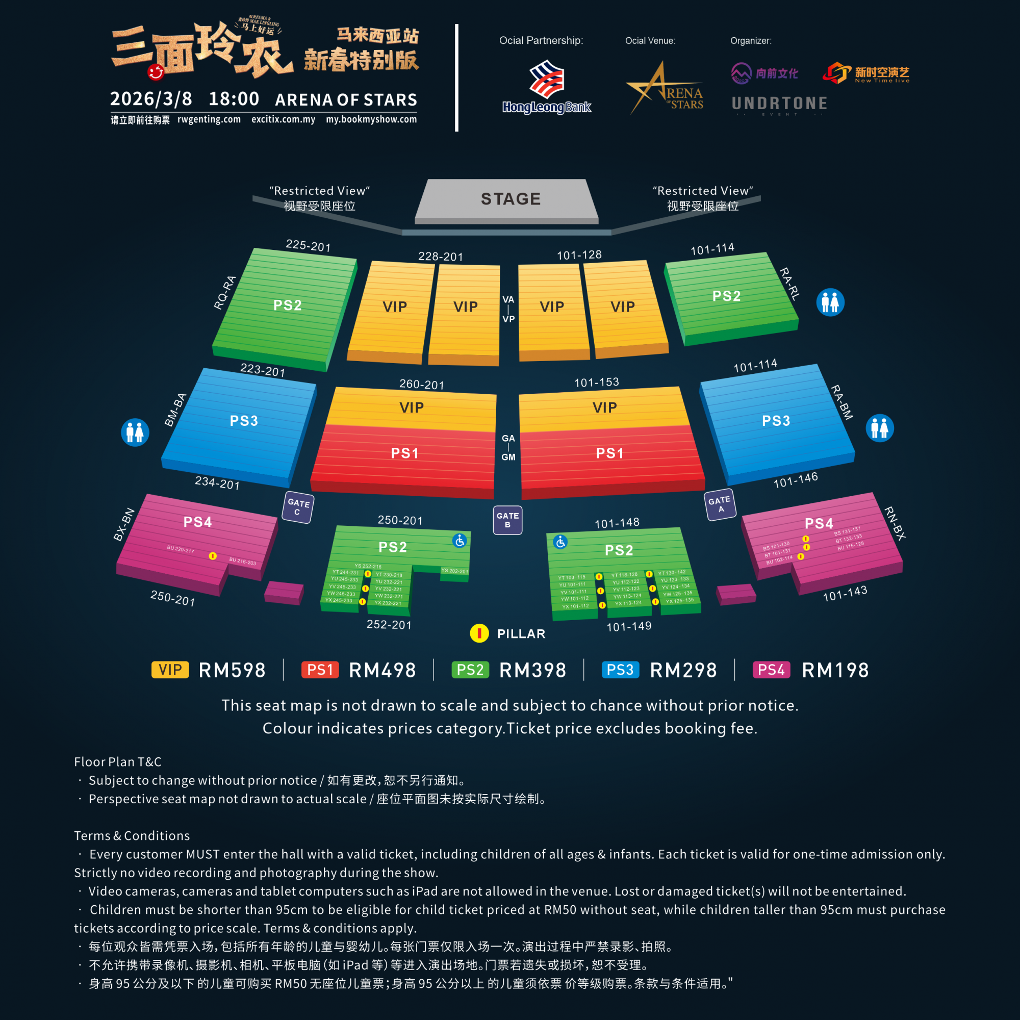 麦玲玲、农夫《三面玲农•马上好运》马来西亚站将于3月8日(星期日),傍晚6时在云顶世界云星剧场举行。门票价格分为598令吉(VIP)、498令吉(PS1)、398令吉(PS2)、298令吉(PS3)及198令吉(PS4),座位均对号入座,门票未包含手续费。售票平台为rwgenting.com,excitix.com.my及BookMyShow。