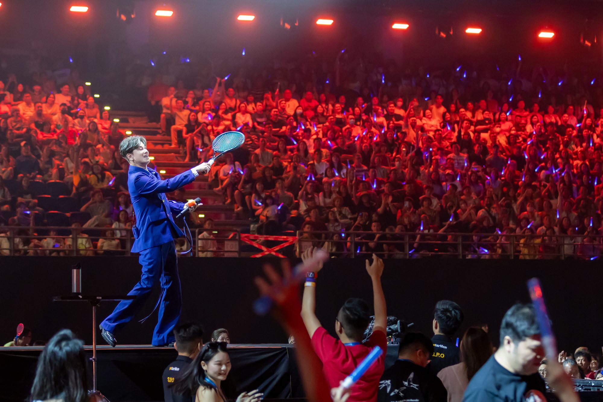热爱网球的他当晚化身“网球王子”,边唱边将签名网球抛向万人观众席,将气氛推向高潮。