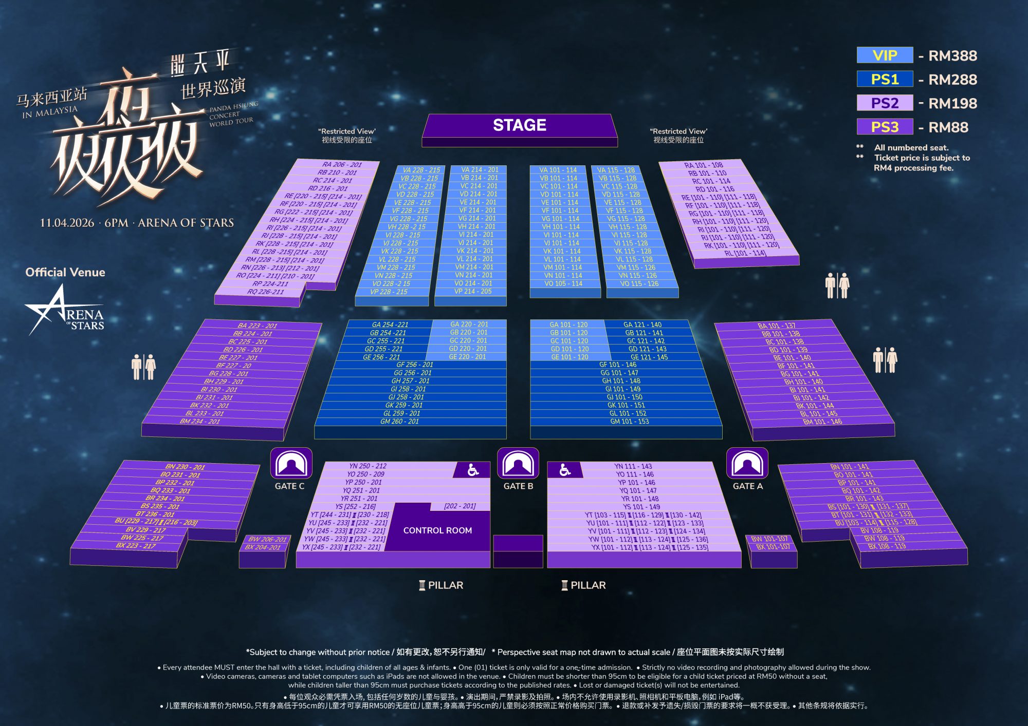 演唱会门票售价为 388 令吉(VIP)、288 令吉(PS1)、198 令吉(PS2)、及 88 令吉 (PS3),所有票价未包含 4 令吉手续费。更多详情请浏览 rwgenting.com。