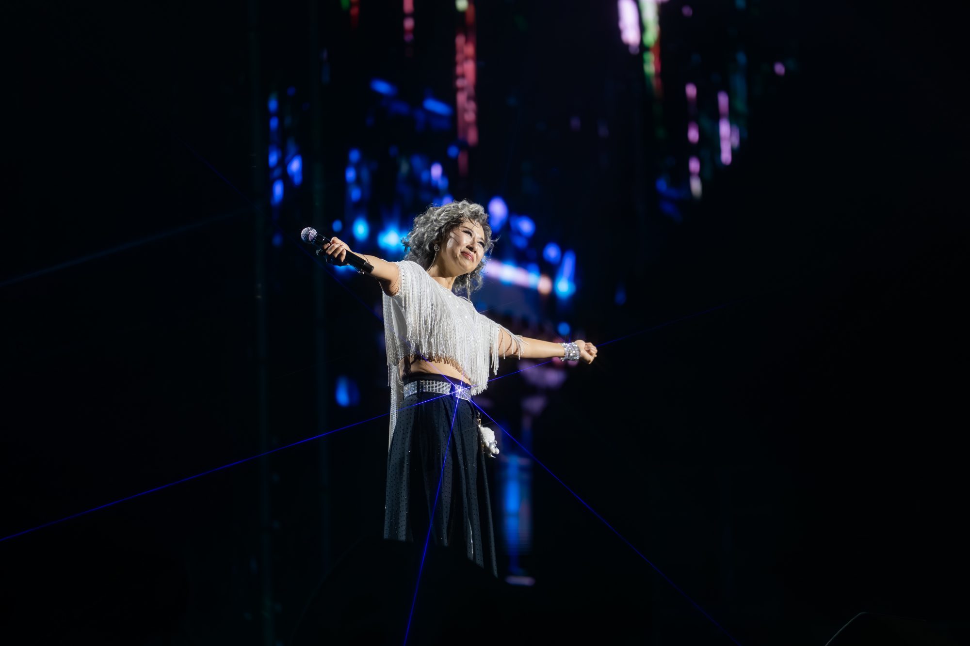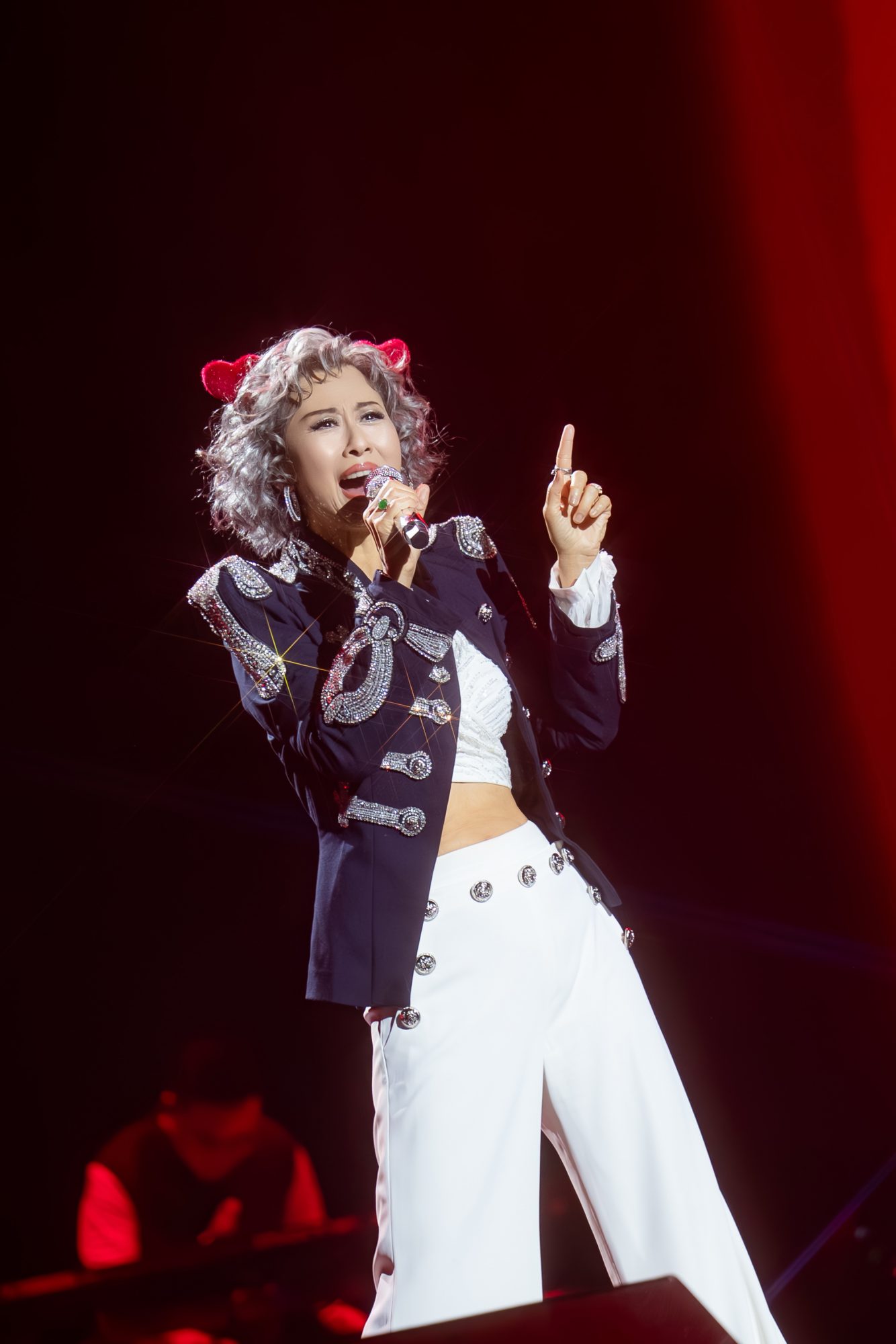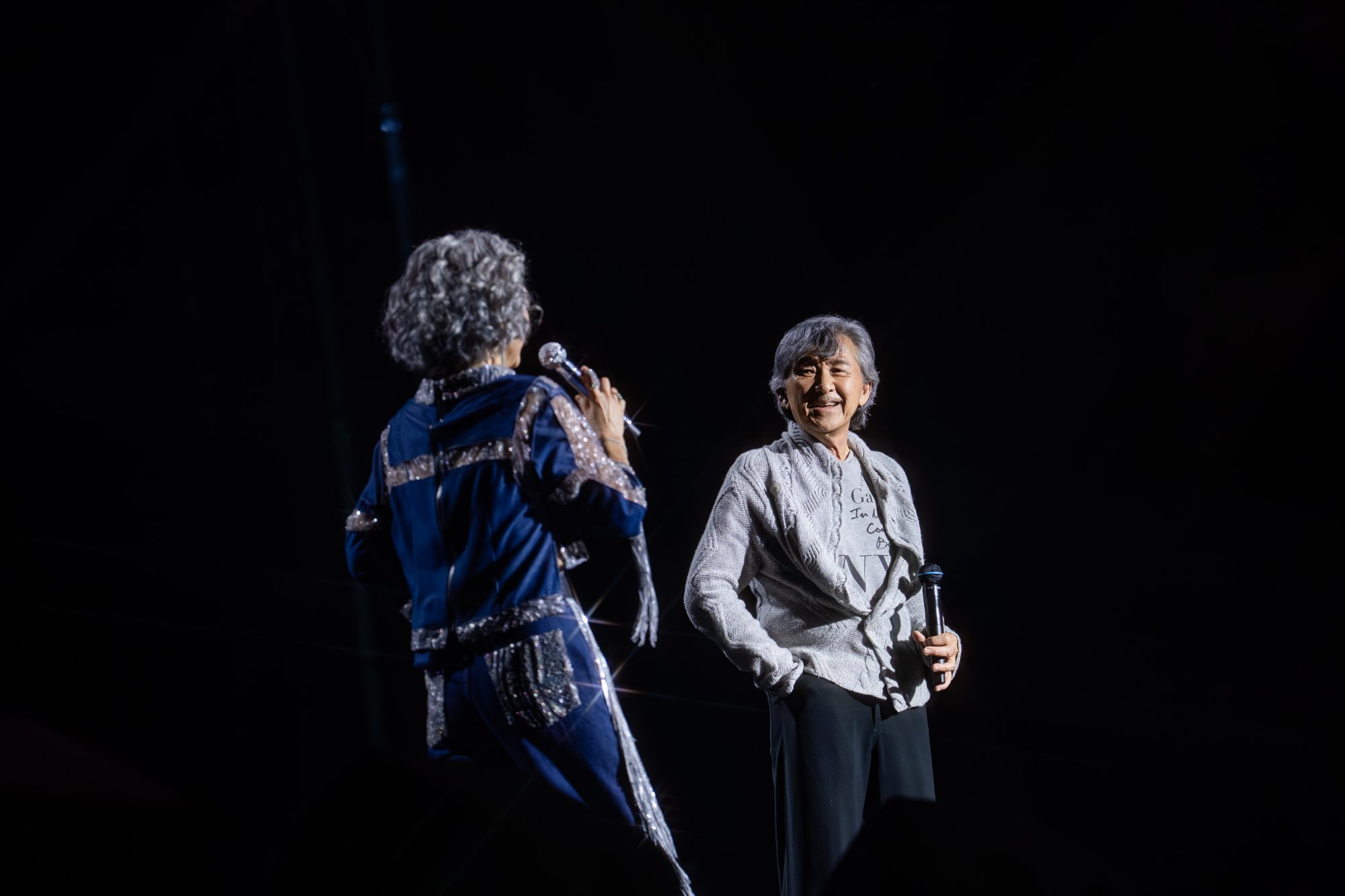 在侧田走上舞台期间,叶倩文脱掉外套露出性感后背,林子祥笑说:“我很久没见过了!”侧田到台上后,更瞬间秒变小粉丝对两人说了很多话!其中还形容叶倩文是年轻歌手,“又唱又跳,很有前途,直接比Lady Gaga厉害!”,叶倩文也直言演出非常有压力,形容像“grandma singing to the grandson!”