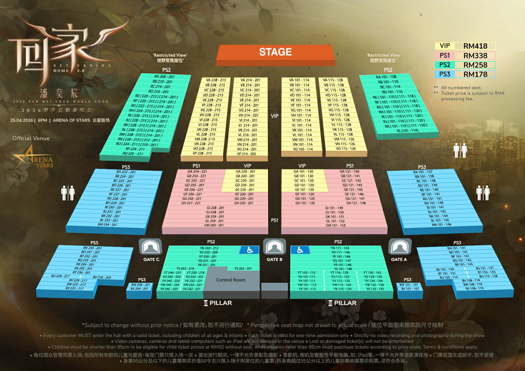 演唱会门票售价为 418 令吉(VIP)、338 令吉(PS1)、258 令吉(PS2)及 178 令吉(PS3),所 有票价未包含 4 令吉手续费。早鸟优惠将于 2026 年 3 月 19 日下午 5 时开售,VIP 至 PS2 票位可享 25%折扣,数量有限,售完即止。早鸟优惠结束后, 凡通过云顶积分、信用卡或现金购票的云尊奖 赏会员将可享有 10%折扣, 同样适用于 VIP 至 PS2 票位。