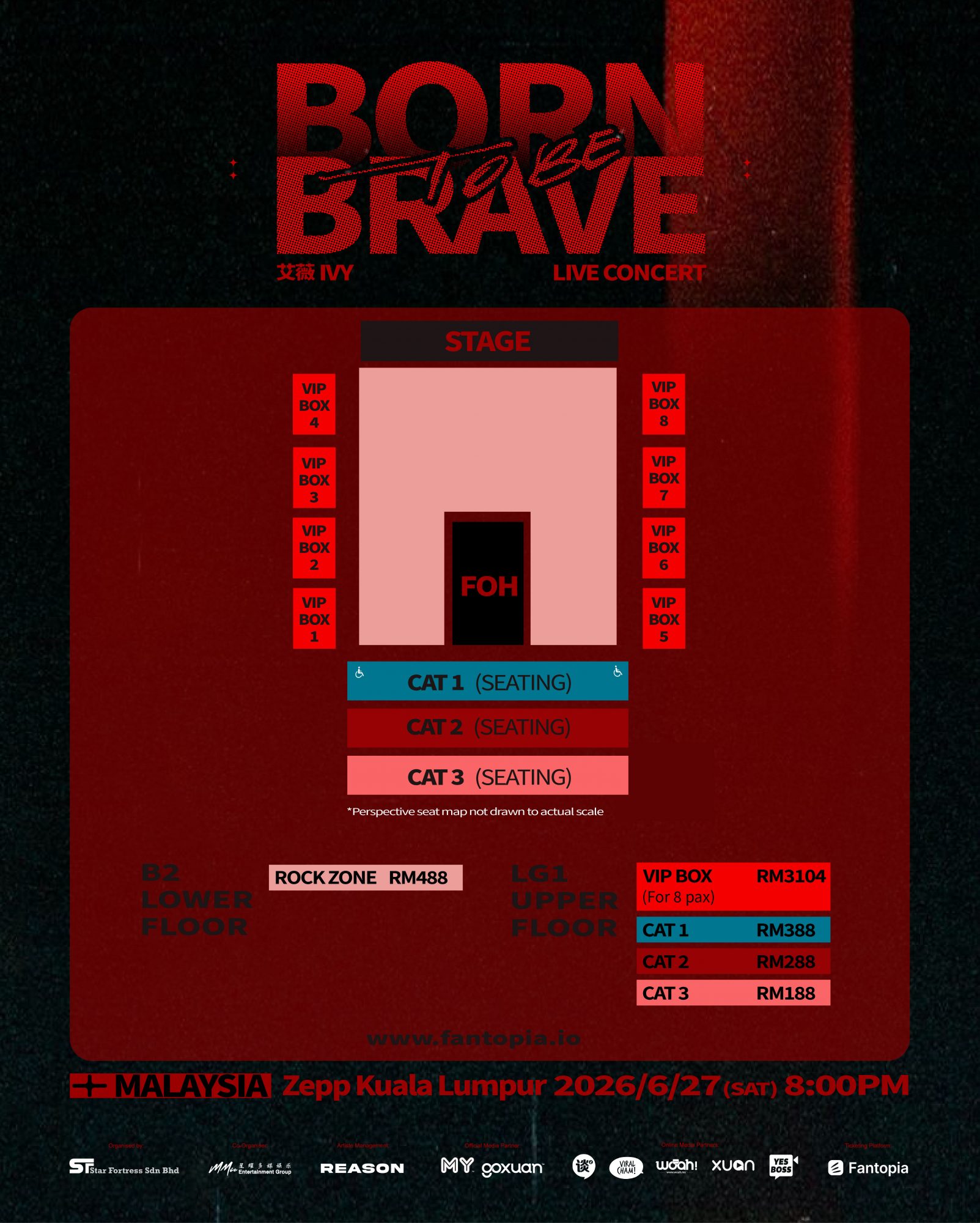 票价: RM3,104 (贵宾厢房-8 位)、RM488、RM388、RM288 及 RM188 (不包含⼿续费)