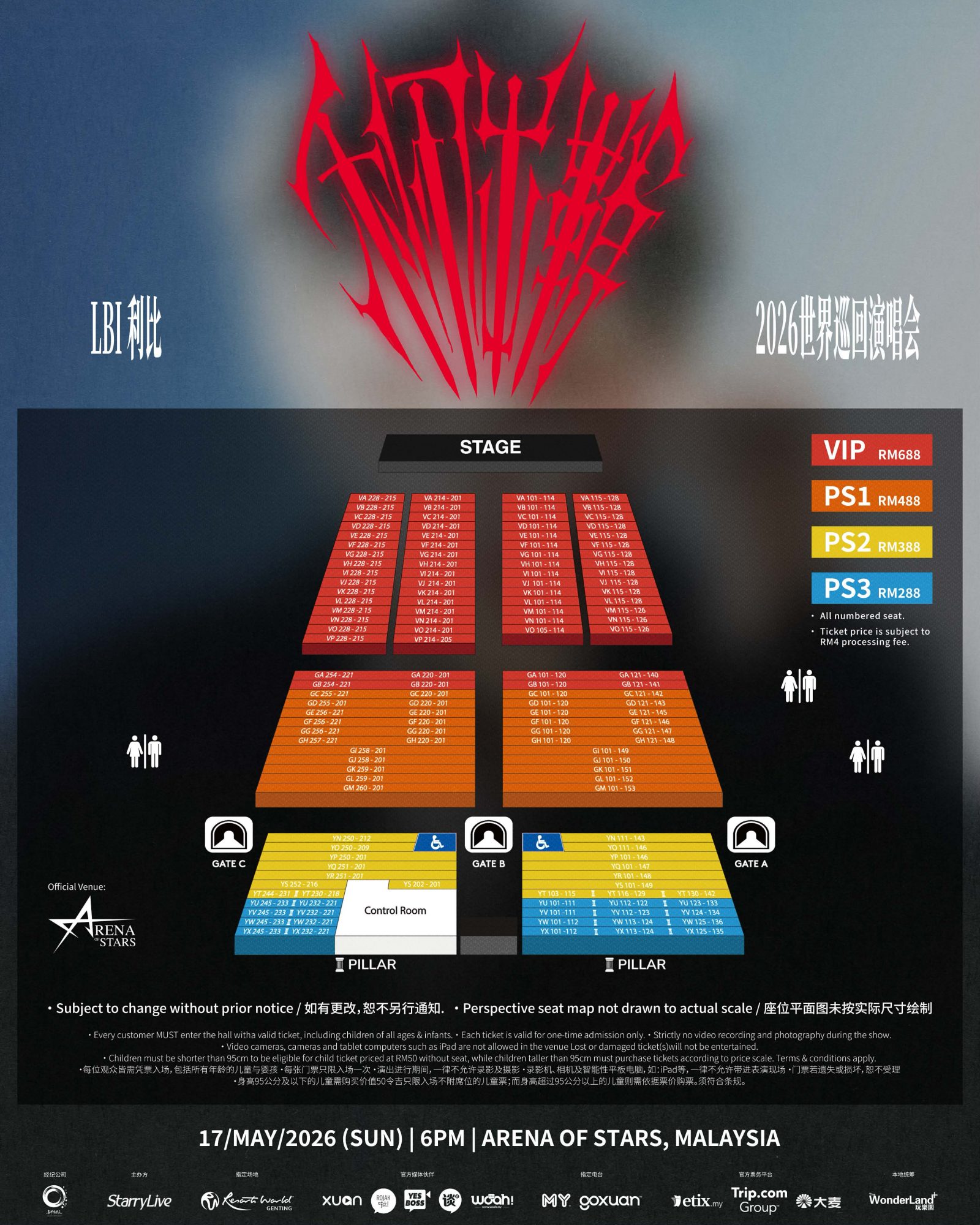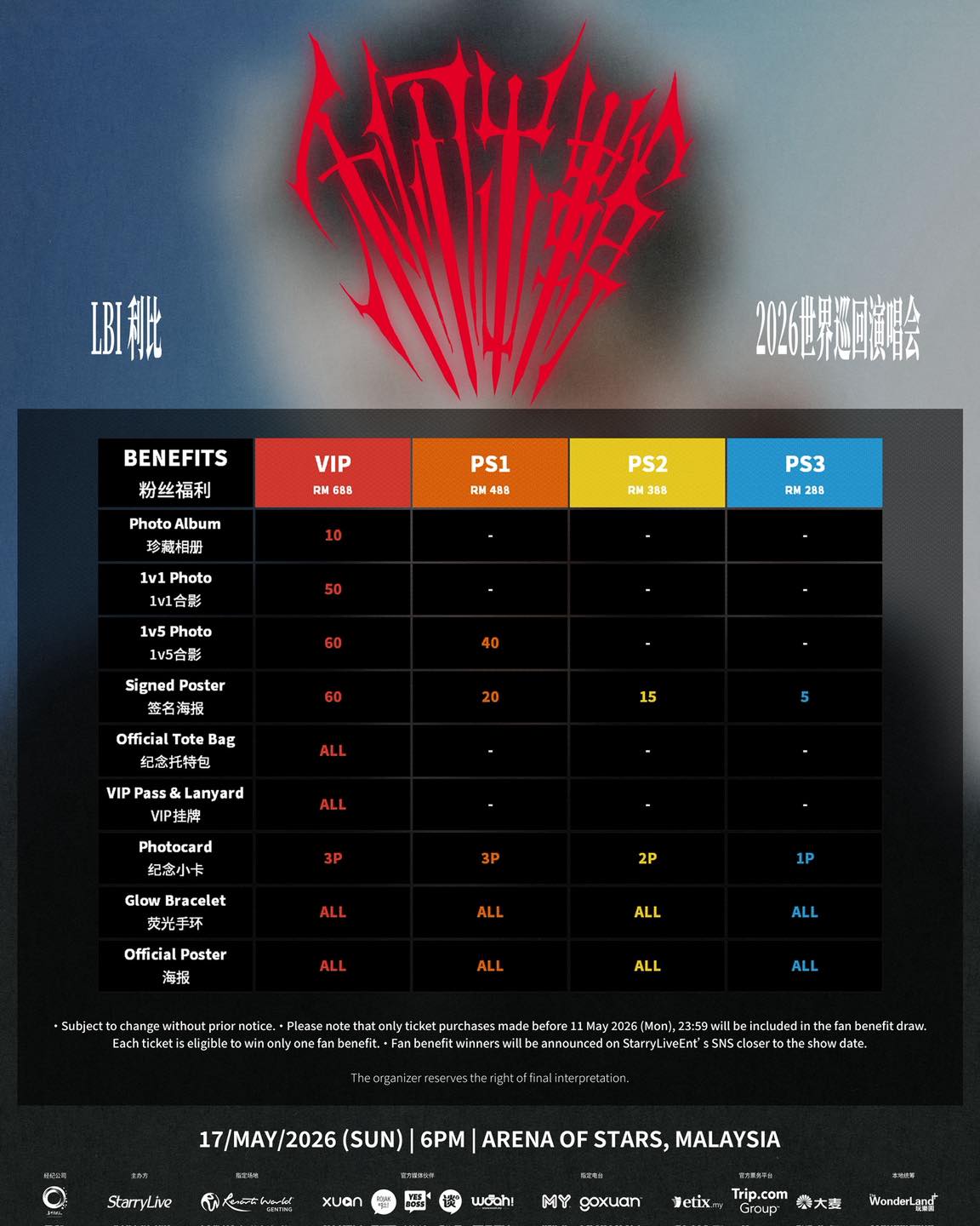 《LBI 利比[利刃出鞘]2026 世界巡回演唱会–马来西亚站》门票价格分别为 688 令吉(VIP)、488 令 吉(PS1)、388 令吉(PS2)及 288 令吉(PS3), 所有票价未含手续费。