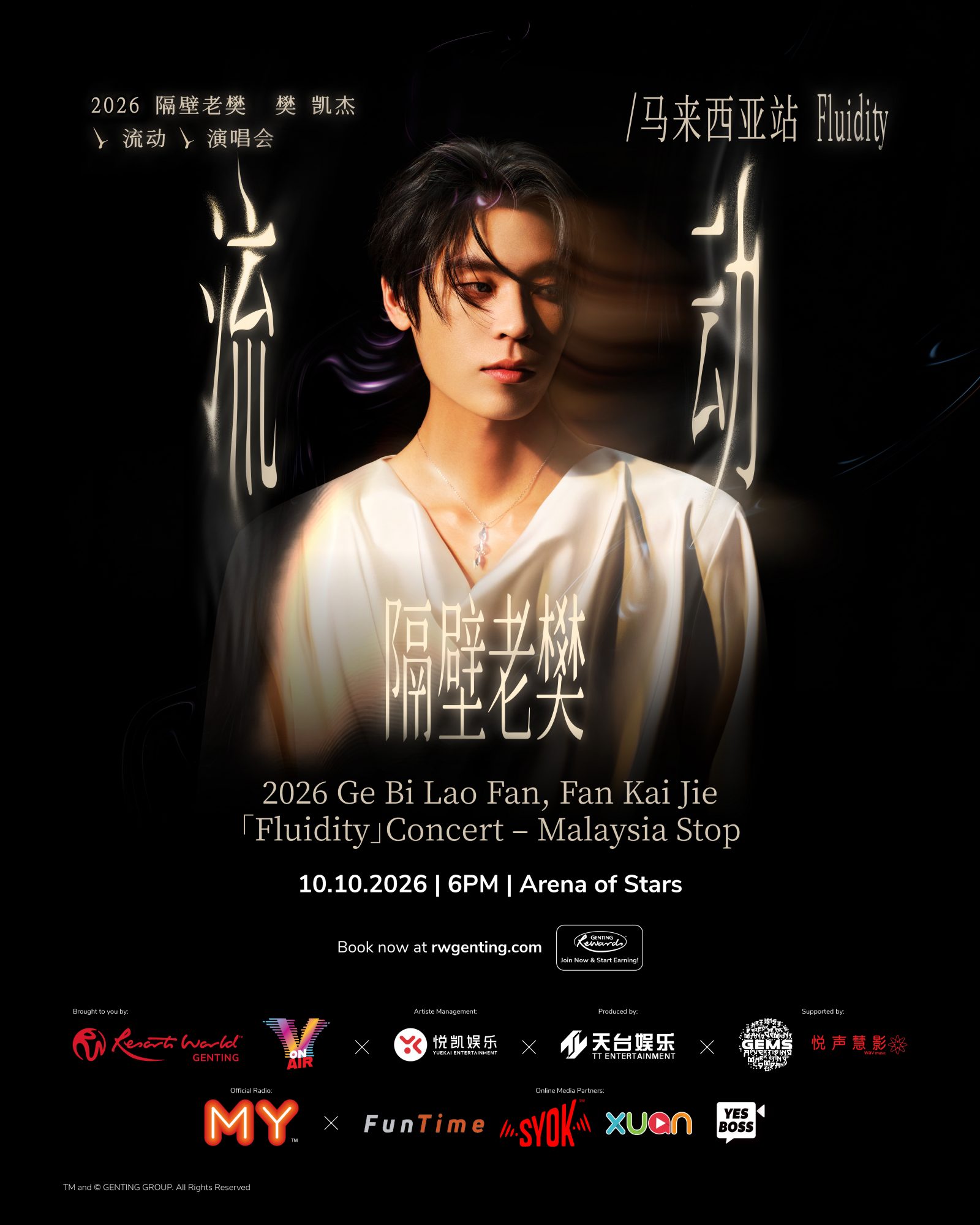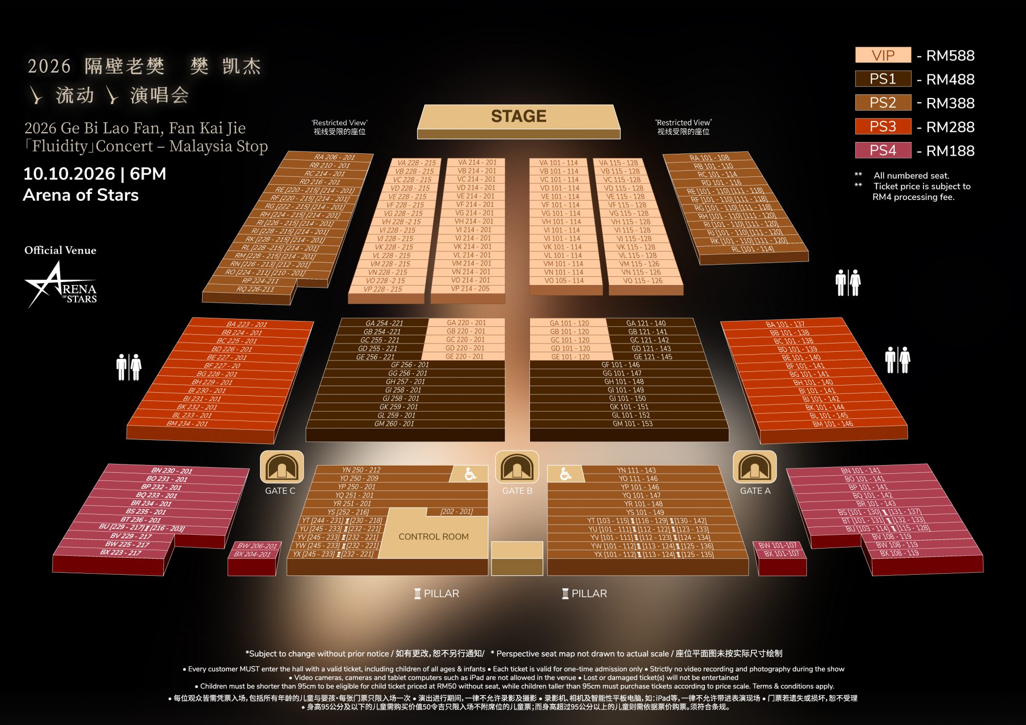 演唱会门票售价为 588 令吉(VIP)、488 令吉(PS1)、388 令吉(PS2)、288 令吉(PS3)及 188 令吉(PS4),所有票价未包含 4 令吉手续费。更多详情请浏览 rwgenting.com。