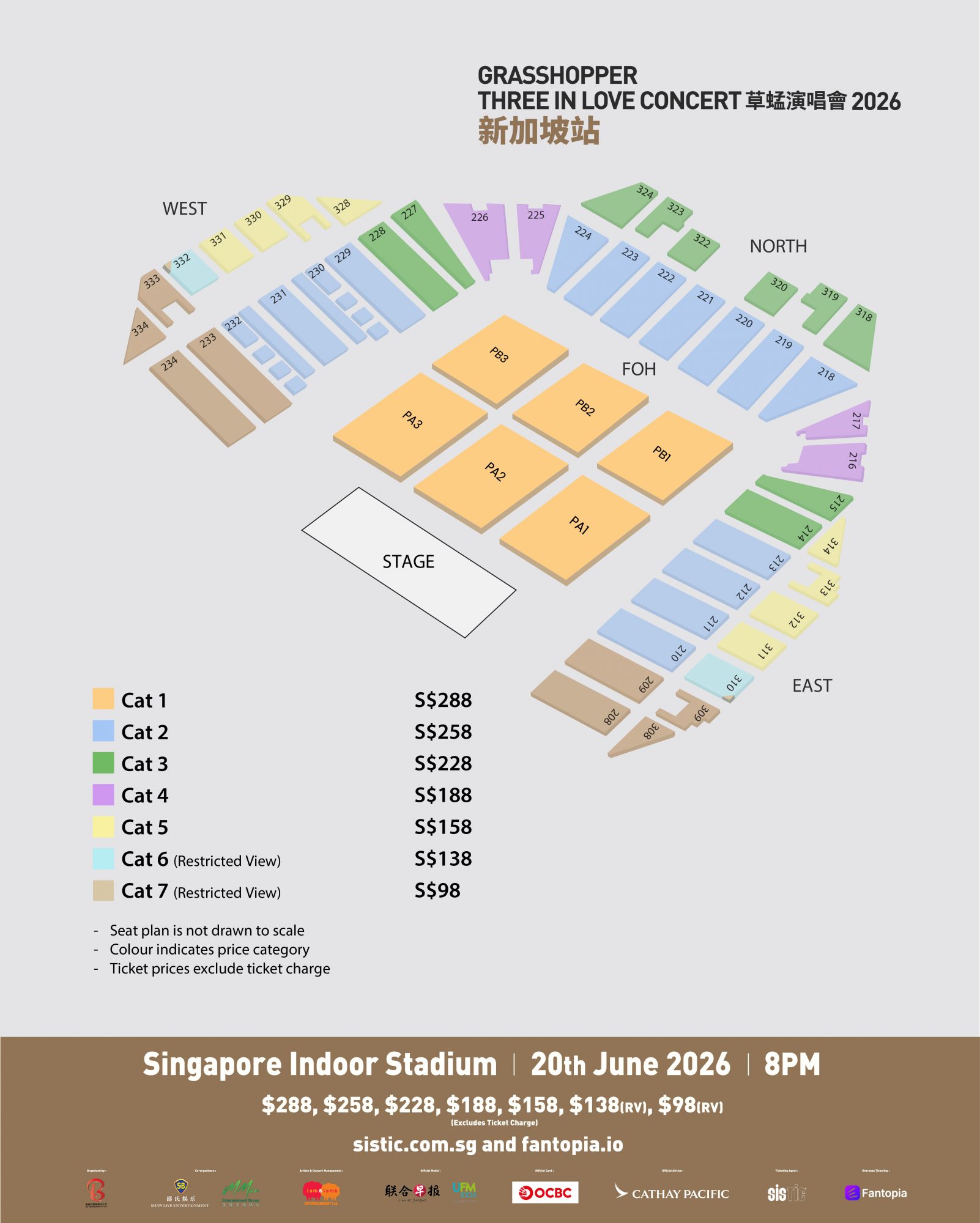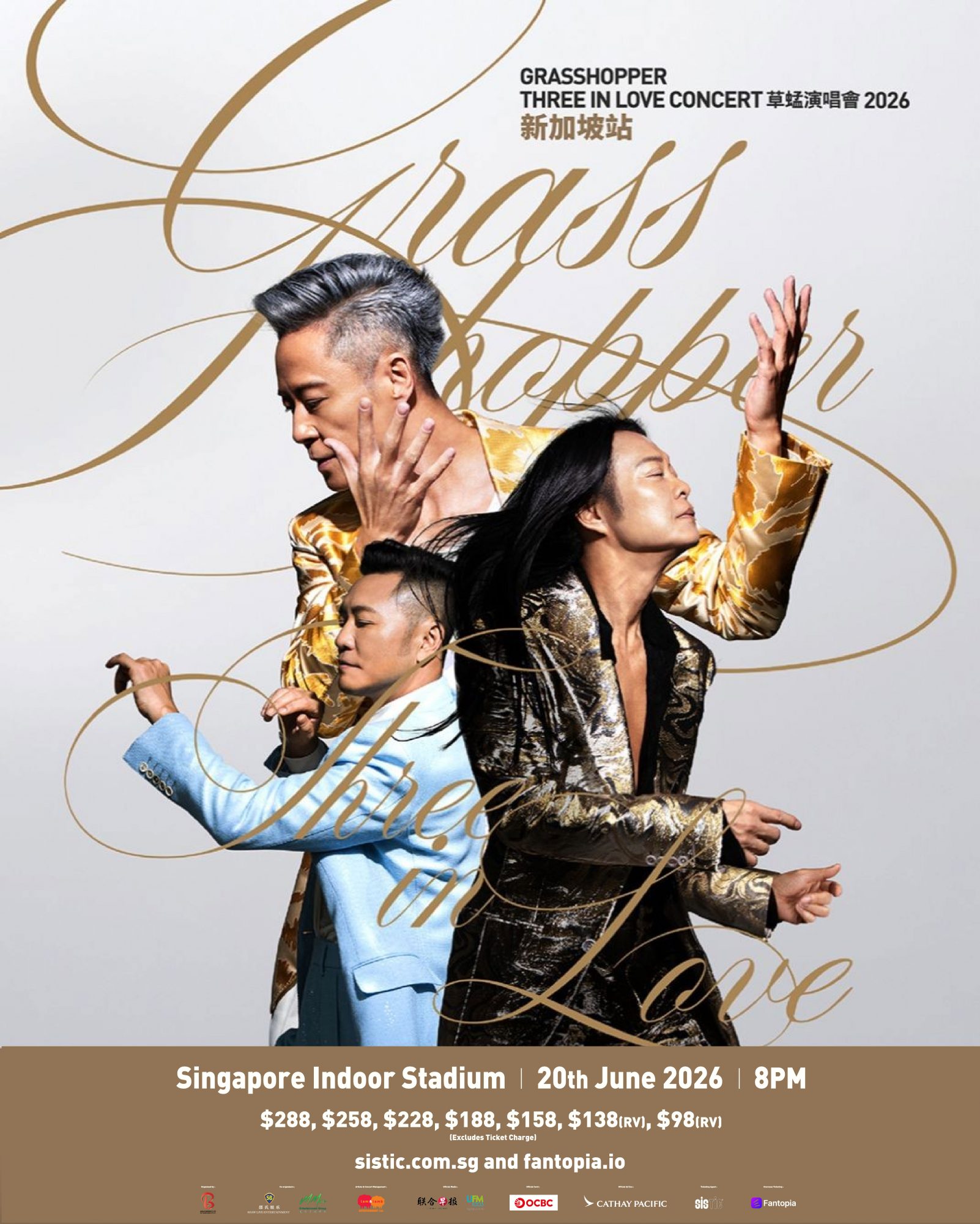 《GRASSHOPPER THREE IN LOVE CONCERT 草蜢演唱会 2026》新加坡站将于 2026 年 6 ⽉20 ⽇(星期六)晚上 8 时,在新加坡室内体育馆(Singapore Indoor Stadium)盛⼤举⾏。