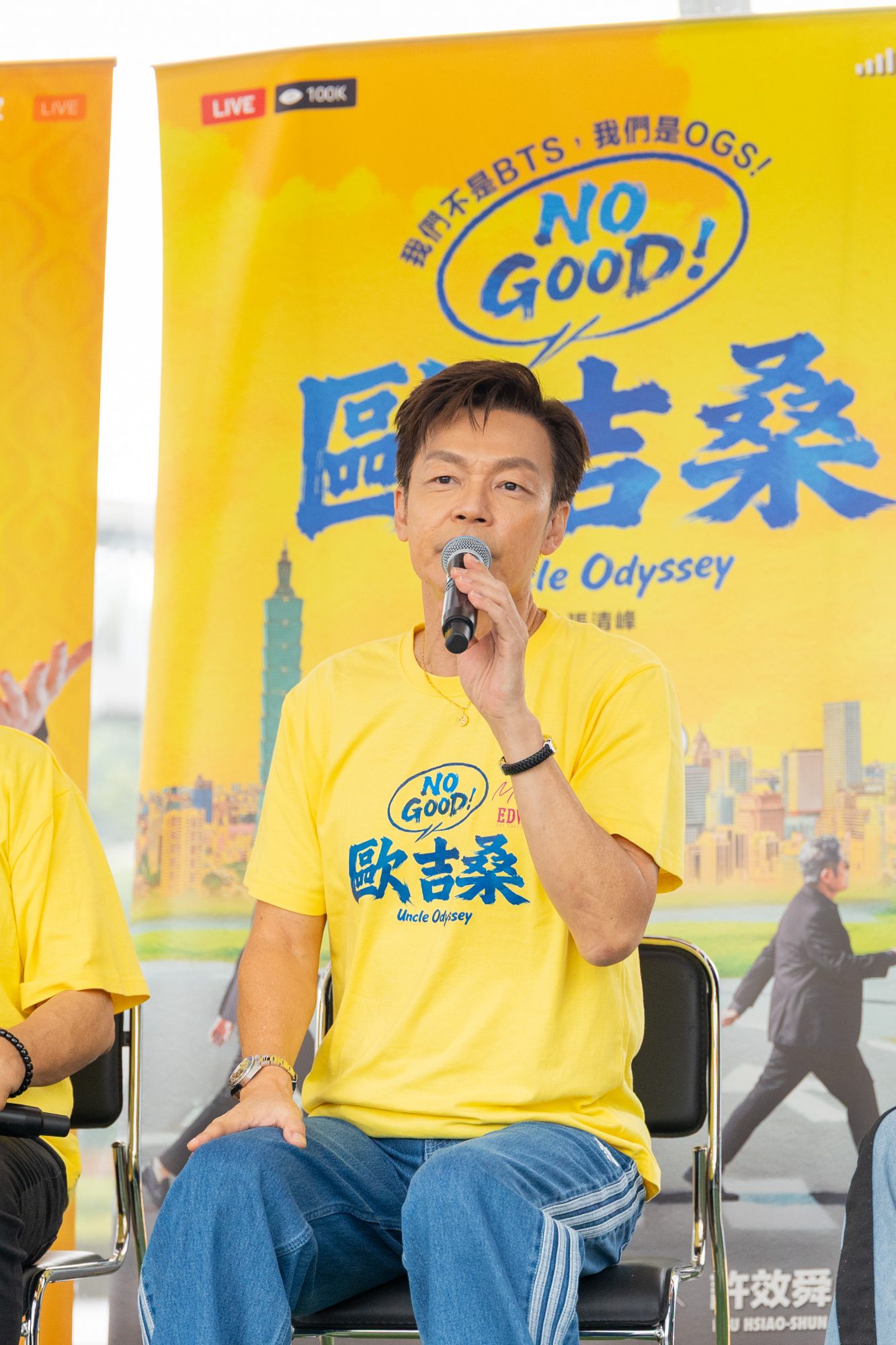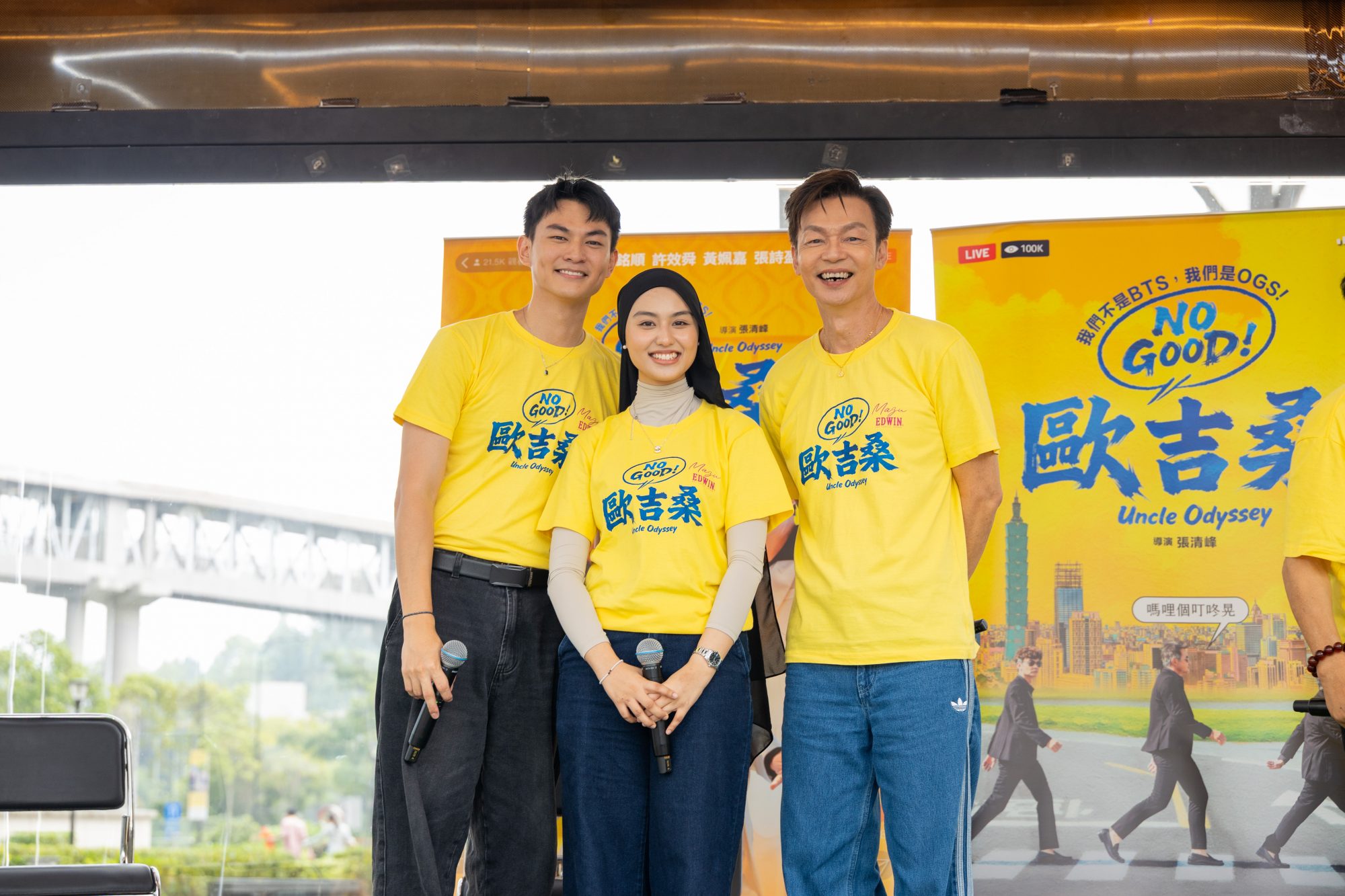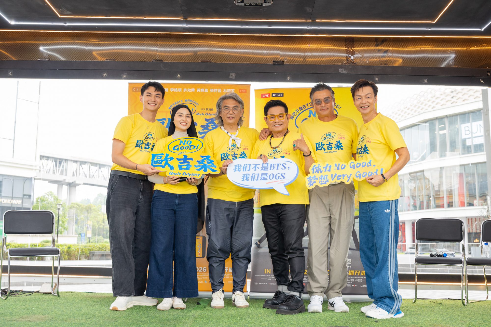 《NO GOOD!欧吉桑》三位主角包括金钟视帝李铭顺、新加坡喜剧天王李国煌及综艺天王许效舜乘坐透明大卡车登场记者会,他们一边随着音乐在车上热舞,一边向媒体挥手致意,仿佛把电影中的直播桥段原汁原味搬到现实中,吸睛指数爆表。